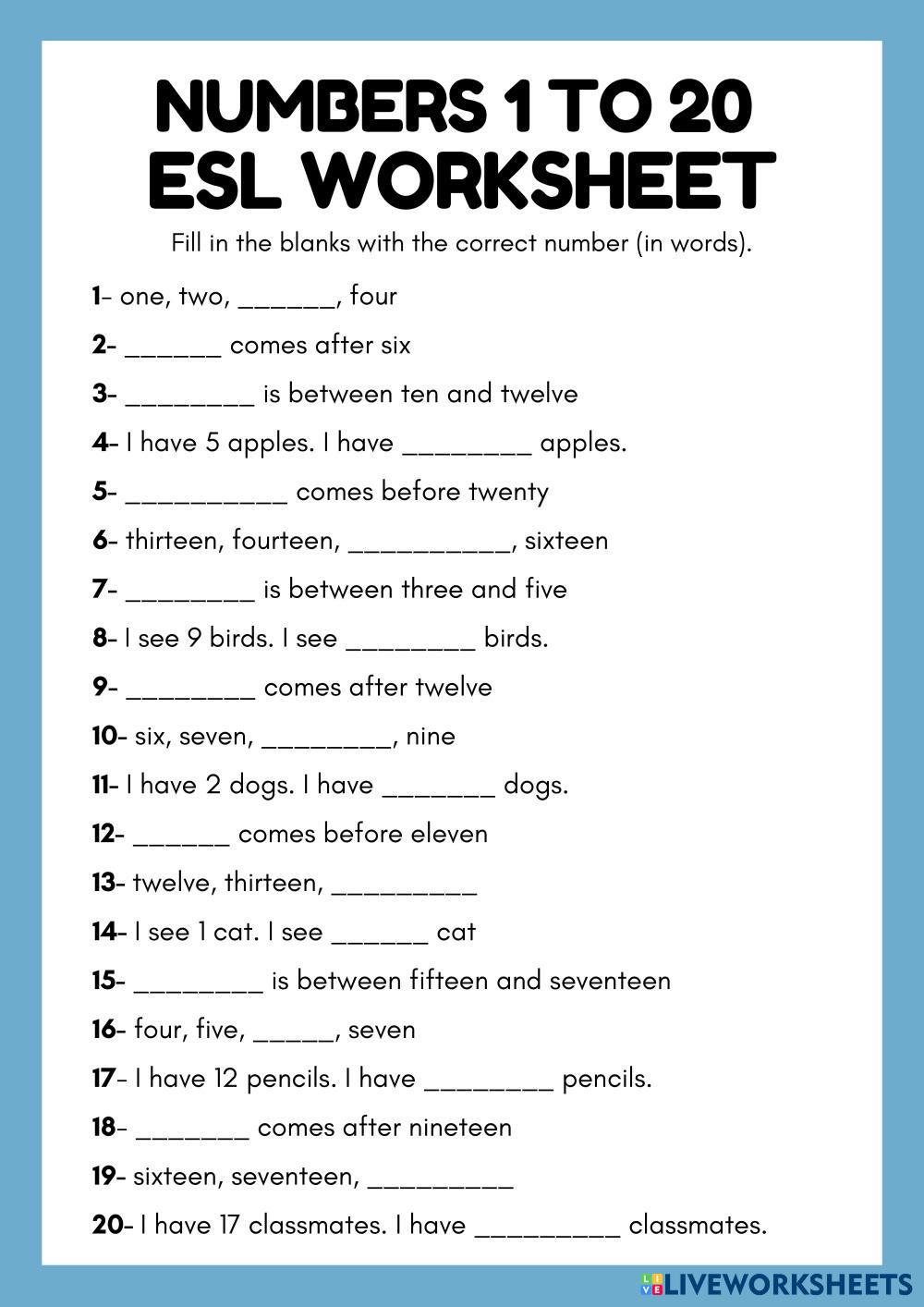 This ESL A1-level worksheet helps your younger students practice their knowledge of the numbers from 1 to 20 written in English.