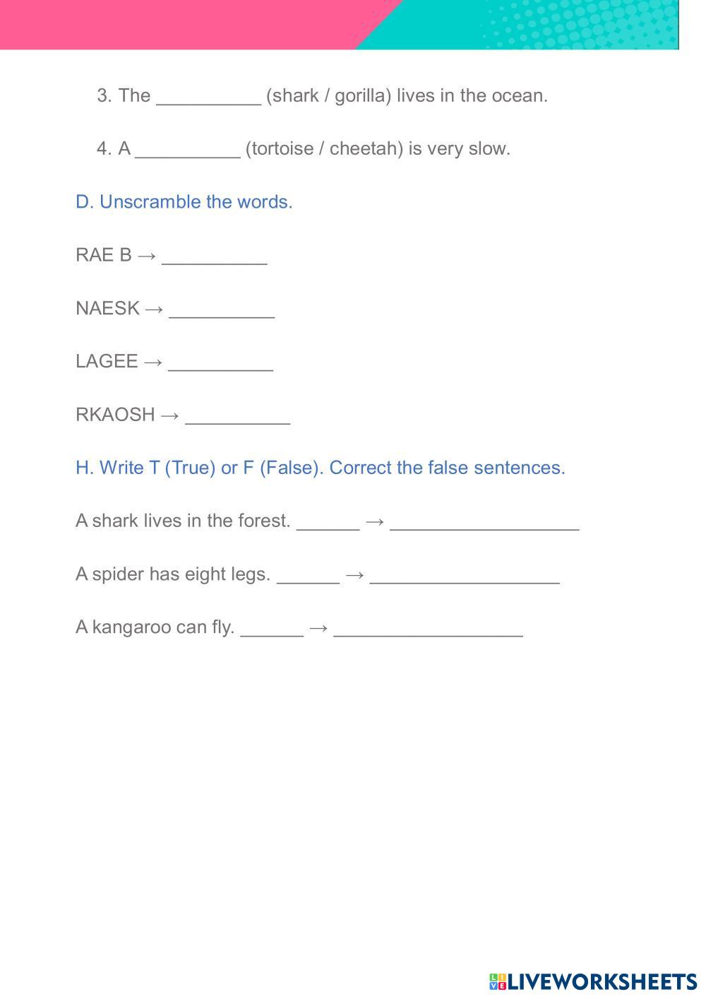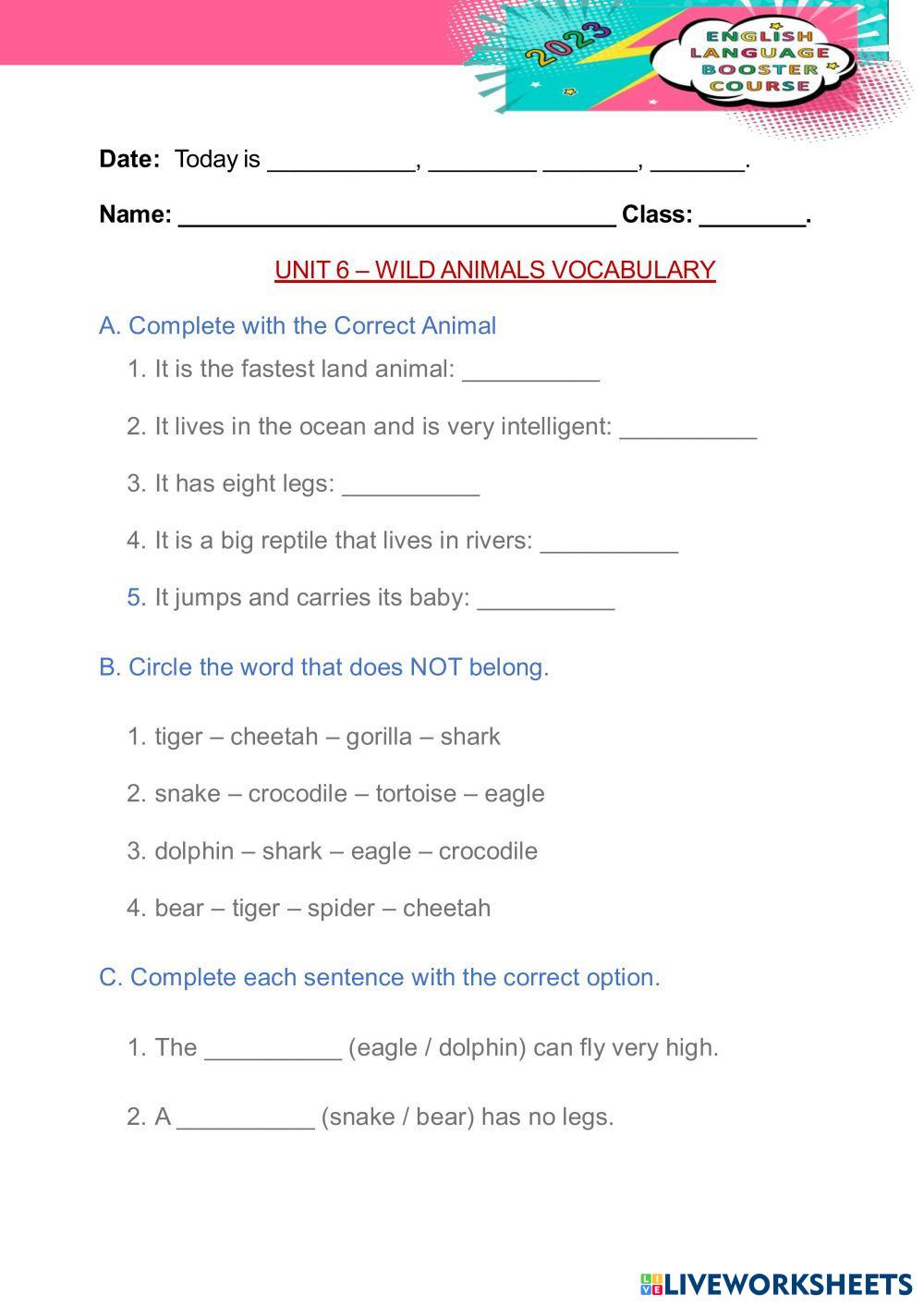 Created by MariAnte ESL English A1 Vocabulary English Author's Instructions DO THE ACTIVITIES My Google Classroom Courses × 0 classes selected (0 students total) Quick Access Select all classes (0 classes) All Classes Loading courses... Cancel Share Share to selected Course __COURSE_NAME__ __STUDENT_NAME__ (__STUDENT_EMAIL__) WILD ANIMALS Download Worksheet Validation Check my answers Emails my answers to my teacher Full name Group/level School subject Teacher's email or key code Close Submit Validating worksheet... (12) Your answers have been sent to your teacher. Good luck! OK We encountered an error submitting your answers. Please try again. OK Advertisement | Go Ad Free Created by MariAnte ESL English A1 Vocabulary English Author's Instructions DO THE ACTIVITIES Explore Worksheets Comparative and superlative ESL A1 Comparative and superlative Vocabulary - ESL English as a second language Main content: Comparatives and superlatives Was or were? ESL A1 Was or were? Vocabulary - ESL A worksheet to practice the use of "was" and "were" in very simple sentences, for beginners. Daily Routines ESL A1 Daily Routines Vocabulary - ESL English as a second language For practicing simple present with daily routines. Main content: Daily Routines Other contents: Simple present Free time ESL A1 Free time Vocabulary - ESL Listen and say
