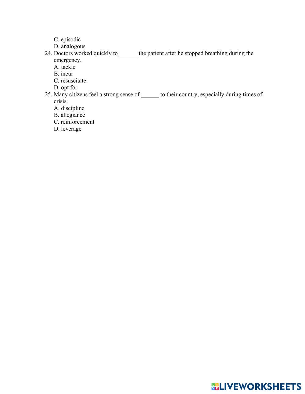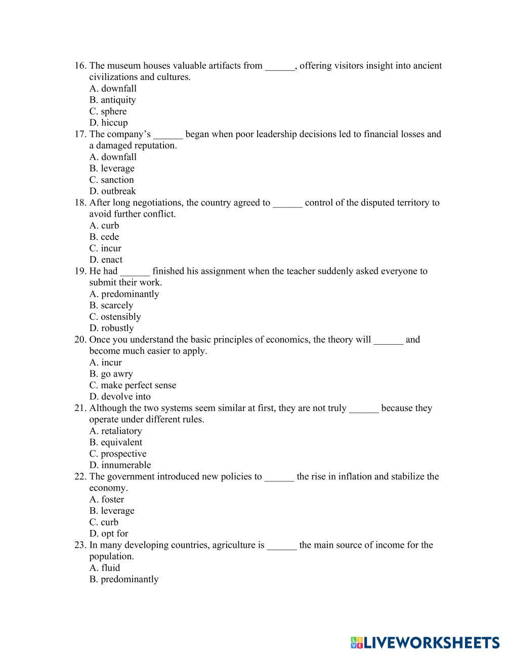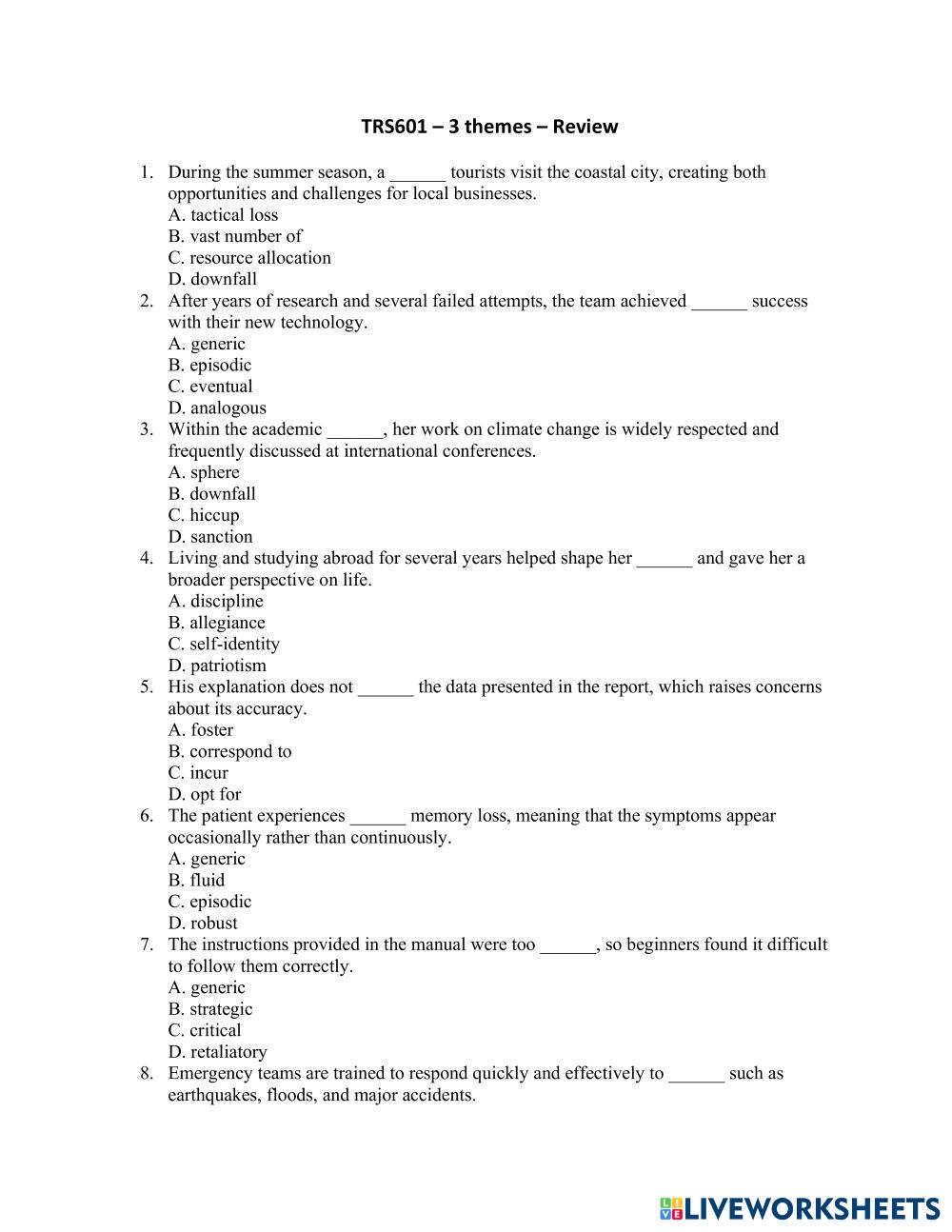 Created by thuydtp ESL English B2 Vocabulary English Author's Instructions Do it My Google Classroom Courses × 0 classes selected (0 students total) Quick Access Select all classes (0 classes) All Classes Loading courses... Cancel Share Share to selected Course __COURSE_NAME__ __STUDENT_NAME__ (__STUDENT_EMAIL__) TRS601 – 3 themes – Review Download Worksheet Validation Check my answers Emails my answers to my teacher Full name Group/level School subject Teacher's email or key code Close Submit Validating worksheet... (12) Your answers have been sent to your teacher. Good luck! OK We encountered an error submitting your answers. Please try again. OK Advertisement | Go Ad Free Created by thuydtp ESL English B2 Vocabulary English Author's Instructions Do it Explore Worksheets Landscape adjectives (advanced) ESL B2 Landscape adjectives (advanced) Vocabulary - ESL ... Wedding Vocabulary B2 Multiple Choice ESL B2 Wedding Vocabulary B2 Multiple Choice Vocabulary - ESL Read the sentences and choose the correct words. TRS601 – Biology 1 – Review ESL B2 TRS601 – Biology 1 – Review Vocabulary - ESL Do it Earth Day - B2 Level ESL Vocabulary Worksheet ESL B2 Earth Day - B2 Level ESL Vocabulary Worksheet Vocabulary - ESL This ESL B2-level vocabulary is ideal for Earth Day.