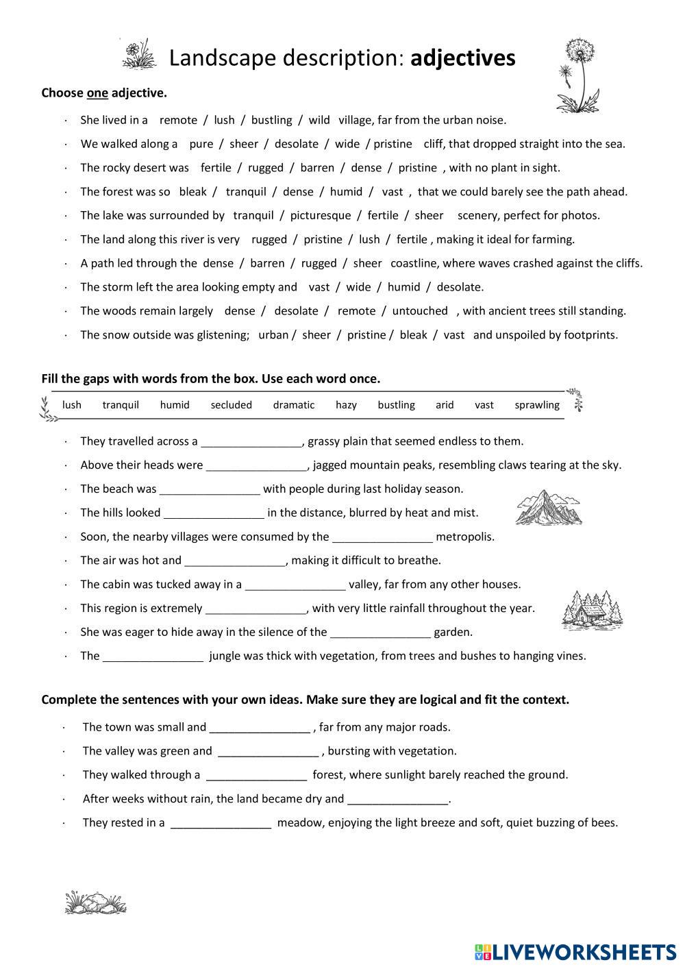 Created byMonika ESL English B2 Vocabulary English Author's Instructions ... My Google Classroom Courses × 0 classes selected (0 students total) Quick Access Select all classes (0 classes) All Classes Loading courses... Cancel Share Share to selected Course __COURSE_NAME__ __STUDENT_NAME__ (__STUDENT_EMAIL__) Landscape adjectives (advanced) Download Worksheet Validation Check my answers Emails my answers to my teacher Full name Group/level School subject Teacher's email or key code Close Submit Validating worksheet... (12) Your answers have been sent to your teacher. Good luck! OK We encountered an error submitting your answers. Please try again. OK Advertisement | Go Ad Free Created byMonika ESL English B2 Vocabulary English Author's Instructions ... Explore Worksheets TRS601 – 3 themes – Review ESL B2 TRS601 – 3 themes – Review Vocabulary - ESL Do it Wedding Vocabulary B2 Multiple Choice ESL B2 Wedding Vocabulary B2 Multiple Choice Vocabulary - ESL Read the sentences and choose the correct words. TRS601 – Biology 1 – Review ESL B2 TRS601 – Biology 1 – Review Vocabulary - ESL Do it Earth Day - B2 Level ESL Vocabulary Worksheet ESL B2 Earth Day - B2 Level ESL Vocabulary Worksheet Vocabulary - ESL This ESL B2-level vocabulary is ideal for Earth Day.