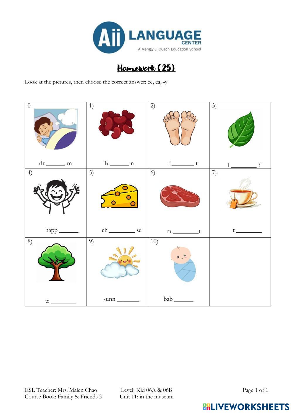 Created byMalen Chao ESL English A2 Vocabulary English Author's Instructions choose the right answer My Google Classroom Courses × 0 classes selected (0 students total) Quick Access Select all classes (0 classes) All Classes Loading courses... Cancel Share Share to selected Course __COURSE_NAME__ __STUDENT_NAME__ (__STUDENT_EMAIL__) long vowel e Download Worksheet Validation Check my answers Emails my answers to my teacher Full name Group/level School subject Teacher's email or key code Close Submit Validating worksheet... (12) Your answers have been sent to your teacher. Good luck! OK We encountered an error submitting your answers. Please try again. OK Advertisement | Go Ad Free Created byMalen Chao ESL English A2 Vocabulary English Author's Instructions choose the right answer Explore Worksheets Reading comprehension ESL A2 Reading comprehension Vocabulary - ESL drag the words to the correct pictures phonic: ld and lt ESL A2 phonic: ld and lt Vocabulary - ESL write the correct answer Homework 07: Food ESL A2 Homework 07: Food Vocabulary - ESL drag the word to the picture adjectives ESL A2 adjectives Vocabulary - ESL choose the correct answer