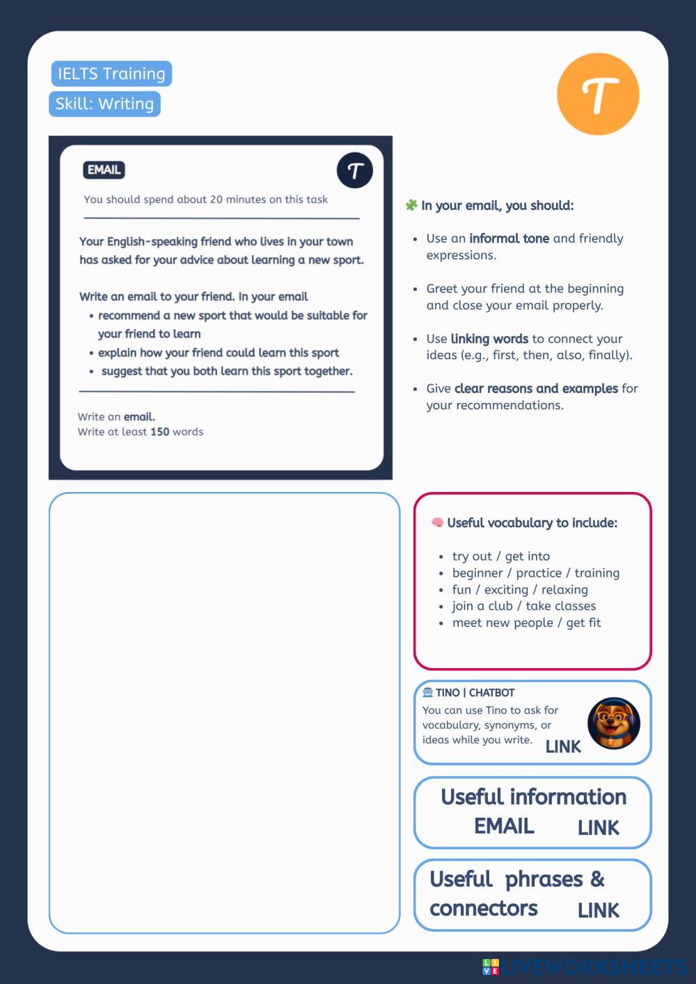 Created by Thinkie ESL English B2-Upper Intermediate Writing English Author's Instructions * My Google Classroom Courses × 0 classes selected (0 students total) Quick Access Select all classes (0 classes) All Classes Loading courses... Cancel Share Share to selected Course __COURSE_NAME__ __STUDENT_NAME__ (__STUDENT_EMAIL__) IELTS Test | Writing Informal Email Download Worksheet Validation Check my answers Emails my answers to my teacher Full name Group/level School subject Teacher's email or key code Close Submit Validating worksheet... (12) Your answers have been sent to your teacher. Good luck! OK We encountered an error submitting your answers. Please try again. OK Advertisement | Go Ad Free Created by Thinkie ESL English B2-Upper Intermediate Writing English Author's Instructions * Explore Worksheets Exam Level XIII - VDZ - Units 5-7 ESL B2-Upper Intermediate Exam Level XIII - VDZ - Units 5-7 Writing - ESL Follow your teacher's instructions. Paraphrasing ESL B2-Upper Intermediate Paraphrasing Writing - ESL Rewrite each sentence using the words given. Do not change the meaning of the original sentence. Write one complete sentence in each case. Mid term exam fce ESL B2-Upper Intermediate Mid term exam fce Writing - ESL mid term exam based on units 1 and 2. complete fce Exam Level V (late test) - Units 5-7 ESL B2-Upper Intermediate Exam Level V (late test) - Units 5-7 Writing - ESL Follow your teacher's instructions