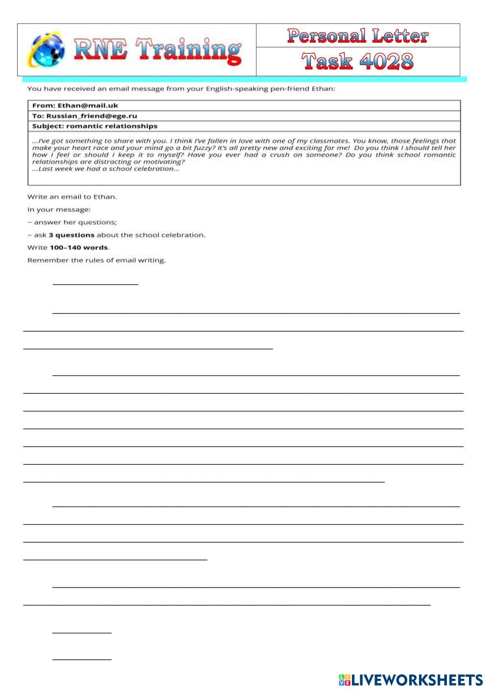 Created byНиколай ESL English A2-Elementary Writing English Author's Instructions Personal letter My Google Classroom Courses × 0 classes selected (0 students total) Quick Access Select all classes (0 classes) All Classes Loading courses... Cancel Share Share to selected Course __COURSE_NAME__ __STUDENT_NAME__ (__STUDENT_EMAIL__) RNE Training 4028 Download Worksheet Validation Check my answers Emails my answers to my teacher Full name Group/level School subject Teacher's email or key code Close Submit Validating worksheet... (12) Your answers have been sent to your teacher. Good luck! OK We encountered an error submitting your answers. Please try again. OK Advertisement | Go Ad Free Created byНиколай ESL English A2-Elementary Writing English Author's Instructions Personal letter Explore Worksheets FA2 - FLUENCY 1 L2 (T7 08-11) ESL A2-Elementary FA2 - FLUENCY 1 L2 (T7 08-11) Writing - ESL FA2 - FLUENCY 1 L2 (T7 08-11) Numbers 1-100 ESL A2-Elementary Numbers 1-100 Writing - ESL Write the numbers Writing rubric ESL A2-Elementary Writing rubric Writing - ESL Put the descriptions into the correct categories and scores. FA3 RV U4-5-6 (T6 07-11) ESL A2-Elementary FA3 RV U4-5-6 (T6 07-11) Writing - ESL FA3 RV U4-5-6 (T6 07-11)