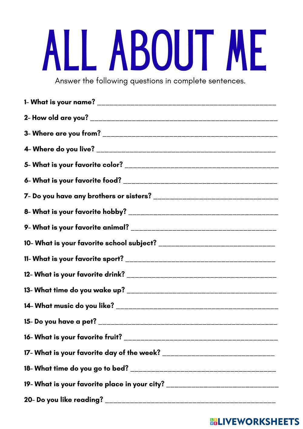 In this A2-level ESL worksheet, students must read questions about themselves and answer them in full sentences in English.