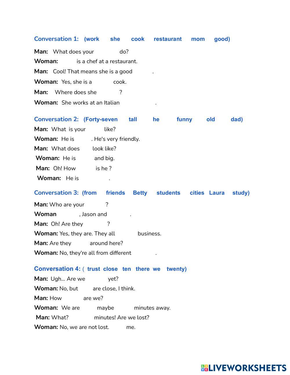 Created byNancy Estrada ESL A1 Writing English Author's Instructions fill in the blanks My Google Classroom Courses × 0 classes selected (0 students total) Quick Access Select all classes (0 classes) All Classes Loading courses... Cancel Share Share to selected Course __COURSE_NAME__ __STUDENT_NAME__ (__STUDENT_EMAIL__) conversation Download Worksheet Validation Check my answers Emails my answers to my teacher Full name Group/level School subject Teacher's email or key code Close Submit Validating worksheet... (12) Your answers have been sent to your teacher. Good luck! OK We encountered an error submitting your answers. Please try again. OK Advertisement | Go Ad Free Created byNancy Estrada ESL A1 Writing English Author's Instructions fill in the blanks Explore Worksheets PEKERJAAN BIK TAHUN 1 ESL A1 PEKERJAAN BIK TAHUN 1 Writing - ESL PADANKAN GAMBAR DENGAN ISYARAT YANG BETUL. El verbo gustar indirect object pronoun (me, te, le, nos, les) and the correct form of “gustar” ESL A1 El verbo gustar indirect object pronoun (me, te, le, nos, les) and the correct form of “gustar” Writing - ESL Choose the 1) correct indirect object pronoun (me, te, le, nos,, les) and the 2) correct form of “gustar” based on the item(s) in the picture. الدوال المضمنة ESL A1 الدوال المضمنة Writing - ESL صل الاجابة الصحيحة Order of daily routines ESL A1 Order of daily routines Writing - ESL She is Sasha, she is a lawyer, she does the same thing everyday, try to find ou the order of her routine. Put the sentence on its correspondent vignette.