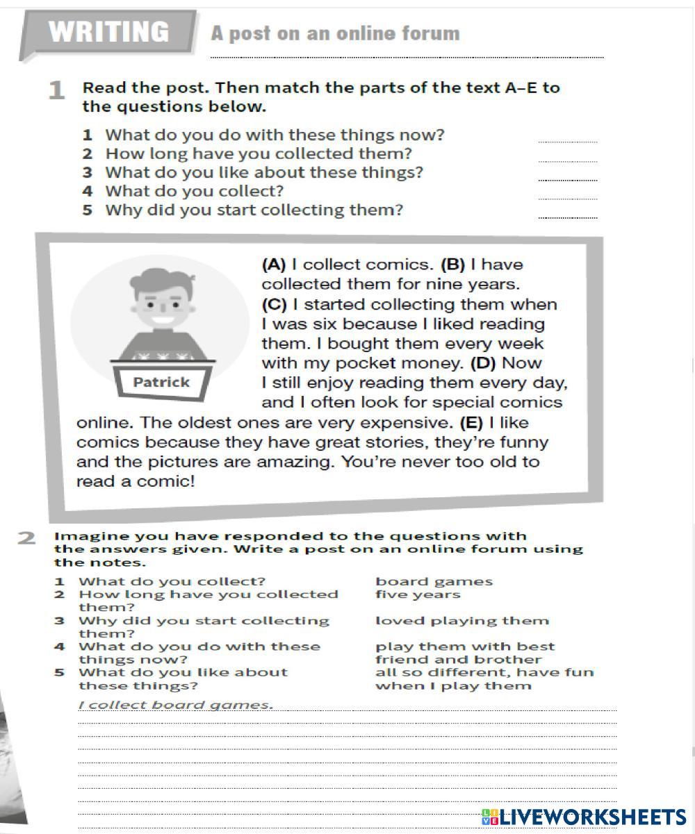 Created by prachukLM ESL English A2 Writing English Author's Instructions Write a post on an online forum My Google Classroom Courses × 0 classes selected (0 students total) Quick Access Select all classes (0 classes) All Classes Loading courses... Cancel Share Share to selected Course __COURSE_NAME__ __STUDENT_NAME__ (__STUDENT_EMAIL__) Prepare 7 U15 Writing Download Worksheet Validation Check my answers Emails my answers to my teacher Full name Group/level School subject Teacher's email or key code Close Submit Validating worksheet... (12) Your answers have been sent to your teacher. Good luck! OK We encountered an error submitting your answers. Please try again. OK Advertisement | Go Ad Free Created by prachukLM ESL English A2 Writing English Author's Instructions Write a post on an online forum Explore Worksheets A personal profile ESL A2 A personal profile Writing - ESL Complete the profile with your information. Include what you want to show on social media third conditional ESL A2 third conditional Writing - ESL follow the instructions POSSESIVE PRONOUNS ESL A2 POSSESIVE PRONOUNS Writing - ESL Read and answer with the correct possesive pronoun Grammar revision Past Simple to be ESL A2 Grammar revision Past Simple to be Writing - ESL Try to insert the words into the correct place
