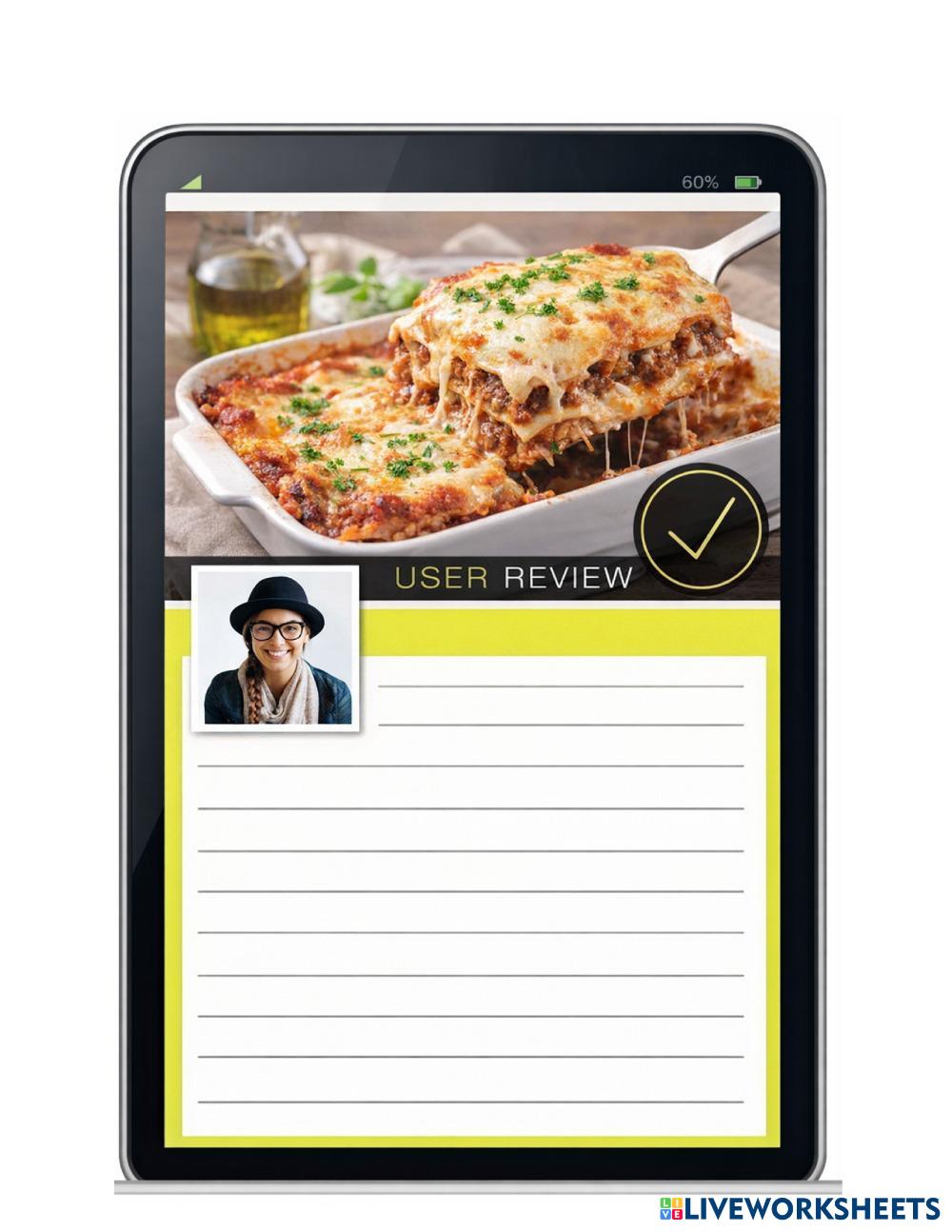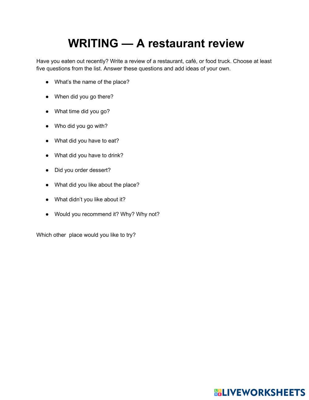 Created by urichavez ESL English B1 Writing English Author's Instructions Write a review of a restaurant, café, or food truck. My Google Classroom Courses × 0 classes selected (0 students total) Quick Access Select all classes (0 classes) All Classes Loading courses... Cancel Share Share to selected Course __COURSE_NAME__ __STUDENT_NAME__ (__STUDENT_EMAIL__) A restaurant review Download Worksheet Validation Check my answers Emails my answers to my teacher Full name Group/level School subject Teacher's email or key code Close Submit Validating worksheet... (12) Your answers have been sent to your teacher. Good luck! OK We encountered an error submitting your answers. Please try again. OK Advertisement | Go Ad Free Created by urichavez ESL English B1 Writing English Author's Instructions Write a review of a restaurant, café, or food truck. Explore Worksheets THIRD CONDITIONAL QUIZ ESL B1 THIRD CONDITIONAL QUIZ Writing - ESL FOLLOW THE INSTRUCTIONS 8 form Ukraine ESL B1 8 form Ukraine Writing - ESL 8 form 6 form Module 6C ESL B1 6 form Module 6C Writing - ESL Full Blast Plus 6C The Gig Economy and “Hustle Culture” ESL B1 The Gig Economy and “Hustle Culture” Writing - ESL Use your skills to do the exercises