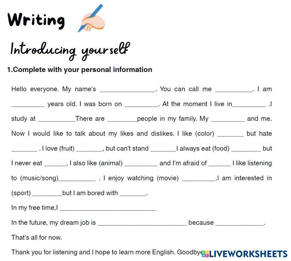 Created by ANDREASACI16 ESL English A1 Writing English Author's Instructions Complete your personal information. My Google Classroom Courses × 0 classes selected (0 students total) Quick Access Select all classes (0 classes) All Classes Loading courses... Cancel Share Share to selected Course __COURSE_NAME__ __STUDENT_NAME__ (__STUDENT_EMAIL__) Introducing yourself Download Worksheet Validation Check my answers Emails my answers to my teacher Full name Group/level School subject Teacher's email or key code Close Submit Validating worksheet... (12) Your answers have been sent to your teacher. Good luck! OK We encountered an error submitting your answers. Please try again. OK Advertisement | Go Ad Free Created by ANDREASACI16 ESL English A1 Writing English Author's Instructions Complete your personal information. Explore Worksheets the colors ESL A1 the colors Writing - ESL colors food ESL A1 food Writing - ESL ingles the colors ESL A1 the colors Writing - ESL the colors Find the animal and write its name ESL A1 Find the animal and write its name Writing - ESL https://www.canva.com/design/DAHENwPRPiI/vG9eYSLmQQNjvQgnhrWgNQ/edit?utm_content=DAHENwPRPiI&utm_campaign=designshare&utm_medium=link2&utm_source=sharebutton