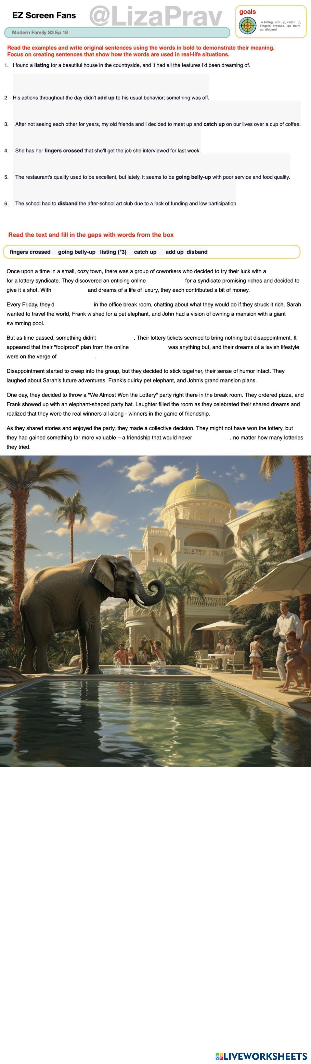 Created by LizaPrav esl Vocabulary Age 12+ level: B2 English Author's Instructions My Google Classroom Courses × 0 classes selected (0 students total) Quick Access Select all classes (0 classes) All Classes Loading courses... Cancel Share Share to selected Course __COURSE_NAME__ __STUDENT_NAME__ (__STUDENT_EMAIL__) Modern Family S3 Ep18 Download Worksheet Validation Check my answers Emails my answers to my teacher Full name Group/level School subject Teacher's email or key code Close Submit Validating worksheet... (12) Your answers have been sent to your teacher. Good luck! OK We encountered an error submitting your answers. Please try again. OK Advertisement | Go Ad Free Created by LizaPrav esl Vocabulary Age 12+ level: B2 English Author's Instructions