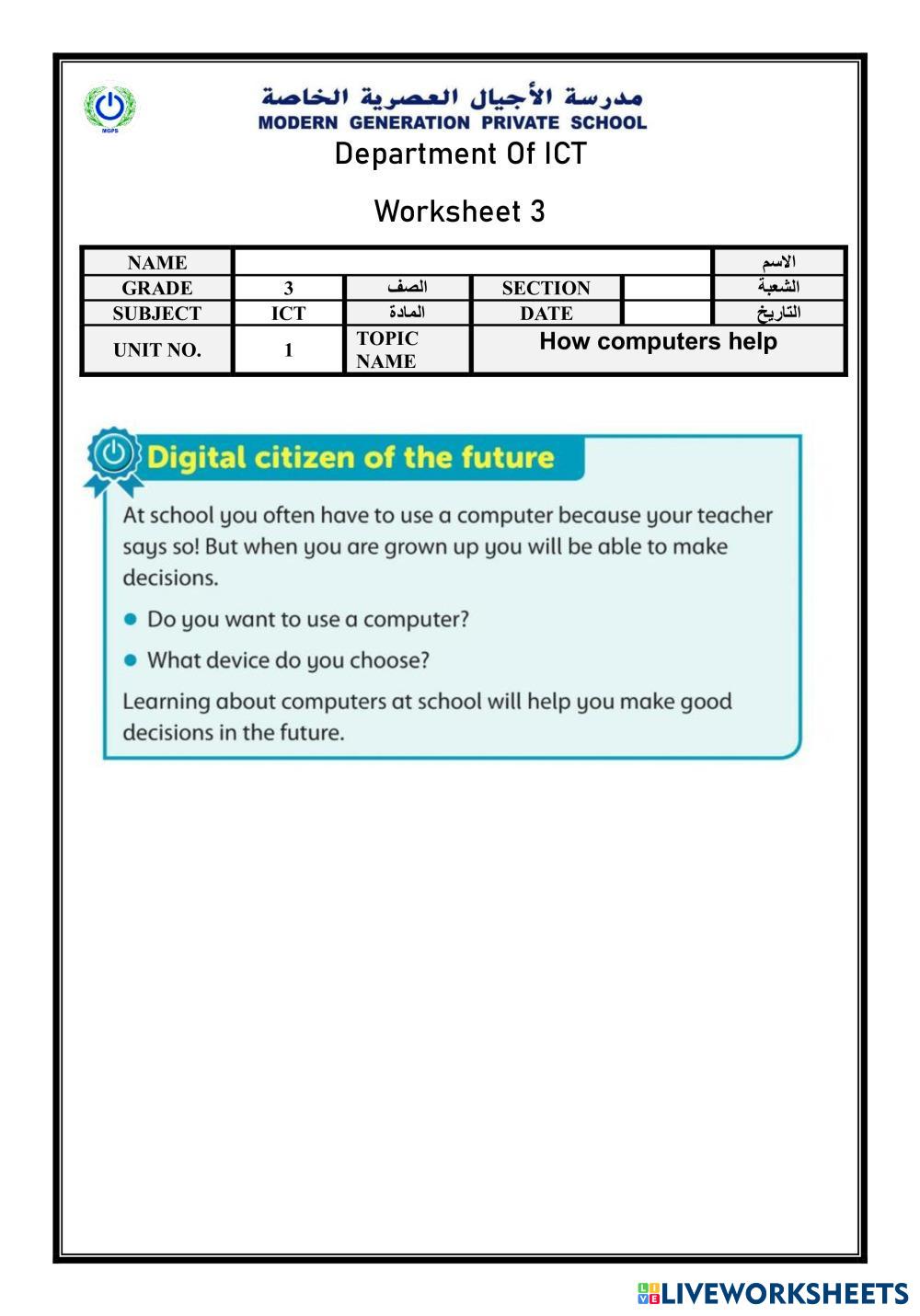 Created by rimaashik ESOL ICT How computers help Age 6-9 level: Grade 3 English Author's Instructions My Google Classroom Courses × 0 classes selected (0 students total) Quick Access Select all classes (0 classes) All Classes Loading courses... Cancel Share Share to selected Course __COURSE_NAME__ __STUDENT_NAME__ (__STUDENT_EMAIL__) Unit 1 - Lesson 3 - ICT Grade 3 Download Worksheet Validation Check my answers Emails my answers to my teacher Full name Group/level School subject Teacher's email or key code Close Submit Validating worksheet... (12) Your answers have been sent to your teacher. Good luck! OK We encountered an error submitting your answers. Please try again. OK Advertisement | Go Ad Free Created by rimaashik ESOL ICT How computers help Age 6-9 level: Grade 3 English Author's Instructions