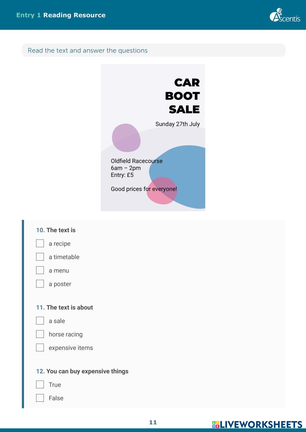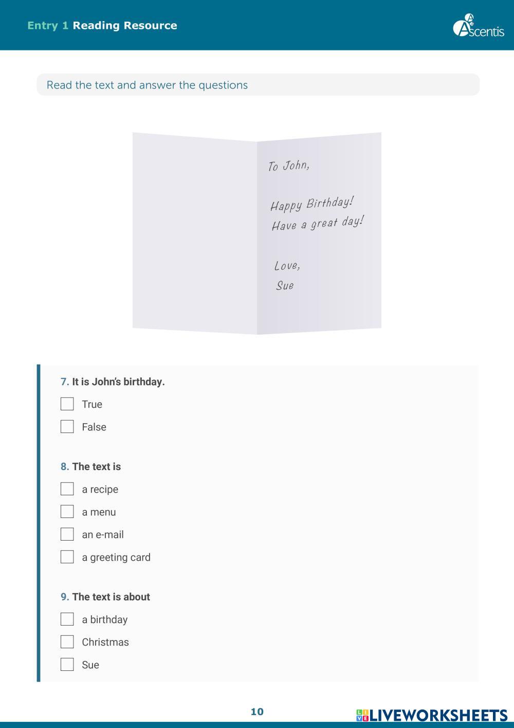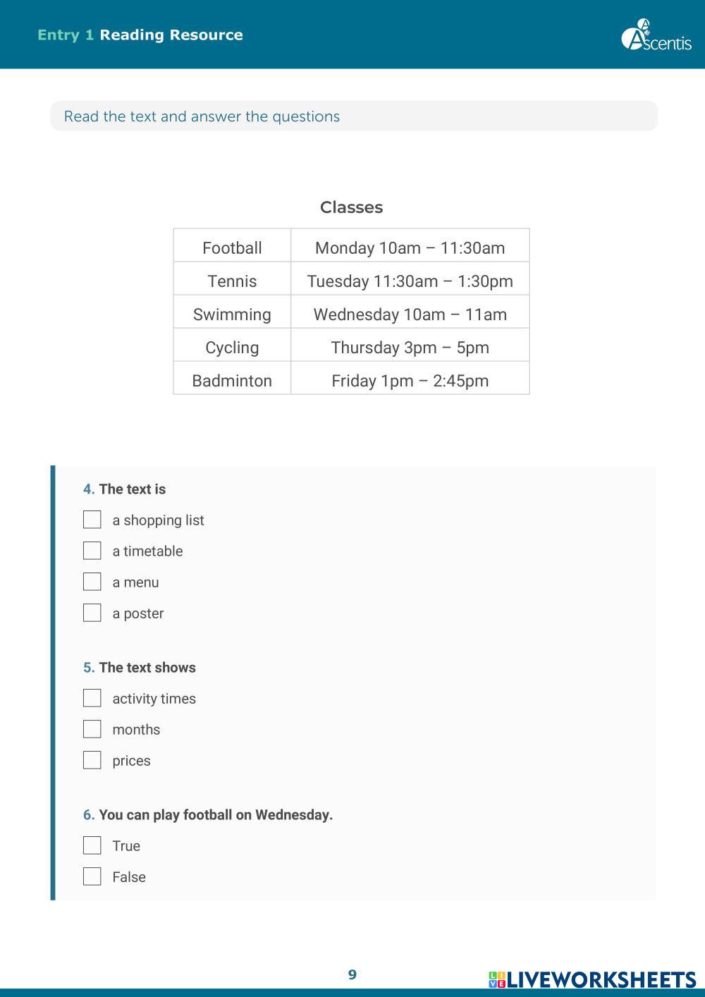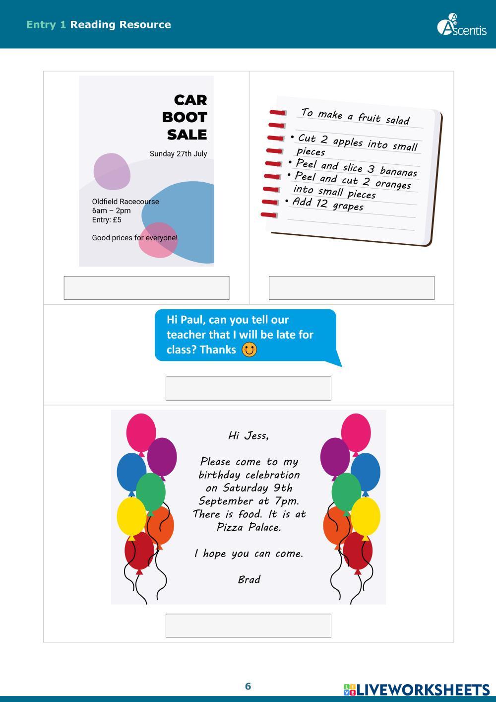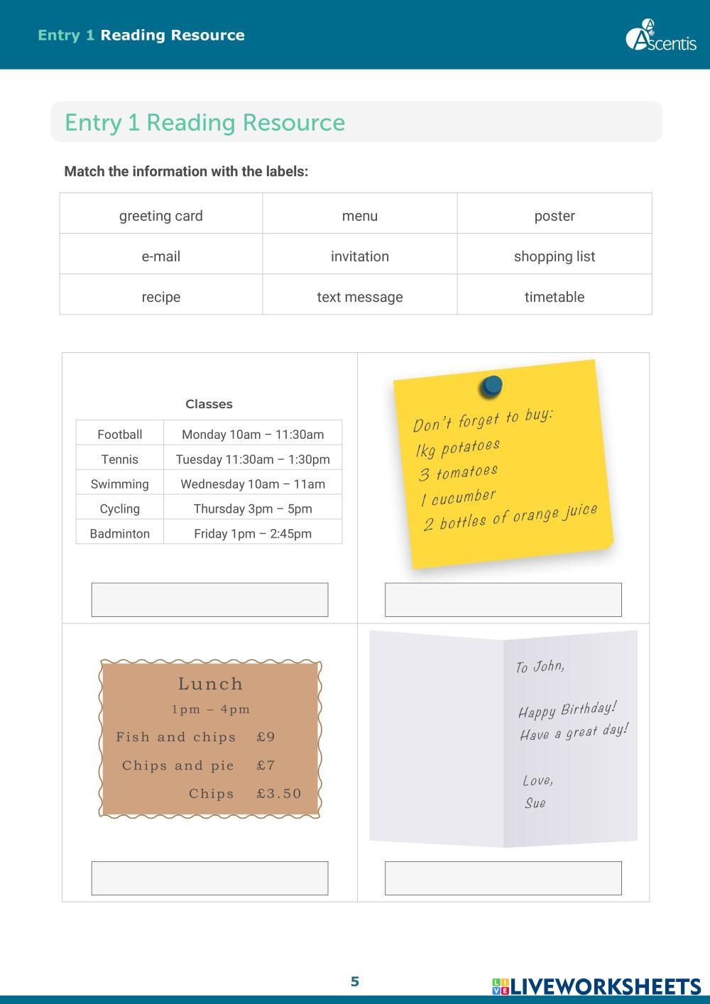 Created by liviac ESOL Reading exam practice Age 6+ level: Entry 1 English Author's Instructions My Google Classroom Courses × 0 classes selected (0 students total) Quick Access Select all classes (0 classes) All Classes Loading courses... Cancel Share Share to selected Course __COURSE_NAME__ __STUDENT_NAME__ (__STUDENT_EMAIL__) ESOL SFL Entry Levels Reading Text-Types Resource.pdf Download Worksheet Validation Check my answers Emails my answers to my teacher Full name Group/level School subject Teacher's email or key code Close Submit Validating worksheet... (12) Your answers have been sent to your teacher. Good luck! OK We encountered an error submitting your answers. Please try again. OK Advertisement | Go Ad Free Created by liviac ESOL Reading exam practice Age 6+ level: Entry 1 English Author's Instructions