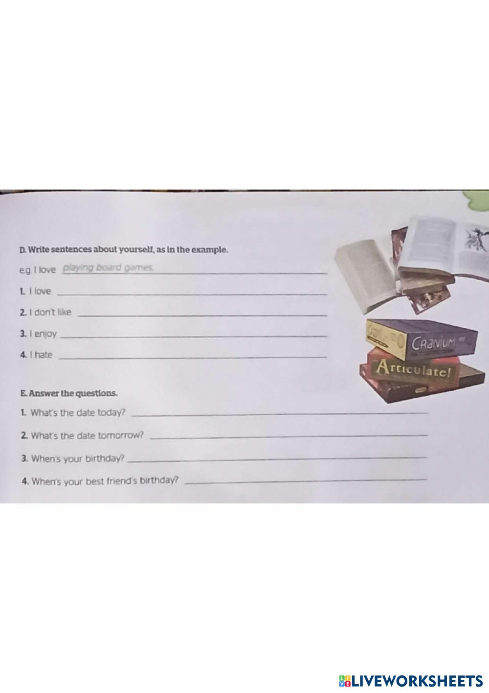 Created byOlena Kharina Events months Age 9-14 level: Grade 5 English Author's Instructions My Google Classroom Courses × 0 classes selected (0 students total) Quick Access Select all classes (0 classes) All Classes Loading courses... Cancel Share Share to selected Course __COURSE_NAME__ __STUDENT_NAME__ (__STUDENT_EMAIL__) Full Blast Plus 5 WB Unit 6a Party Time! p. 58-59 Download Worksheet Validation Check my answers Emails my answers to my teacher Full name Group/level School subject Teacher's email or key code Close Submit Validating worksheet... (12) Your answers have been sent to your teacher. Good luck! OK We encountered an error submitting your answers. Please try again. OK Advertisement | Go Ad Free Created byOlena Kharina Events months Age 9-14 level: Grade 5 English Author's Instructions