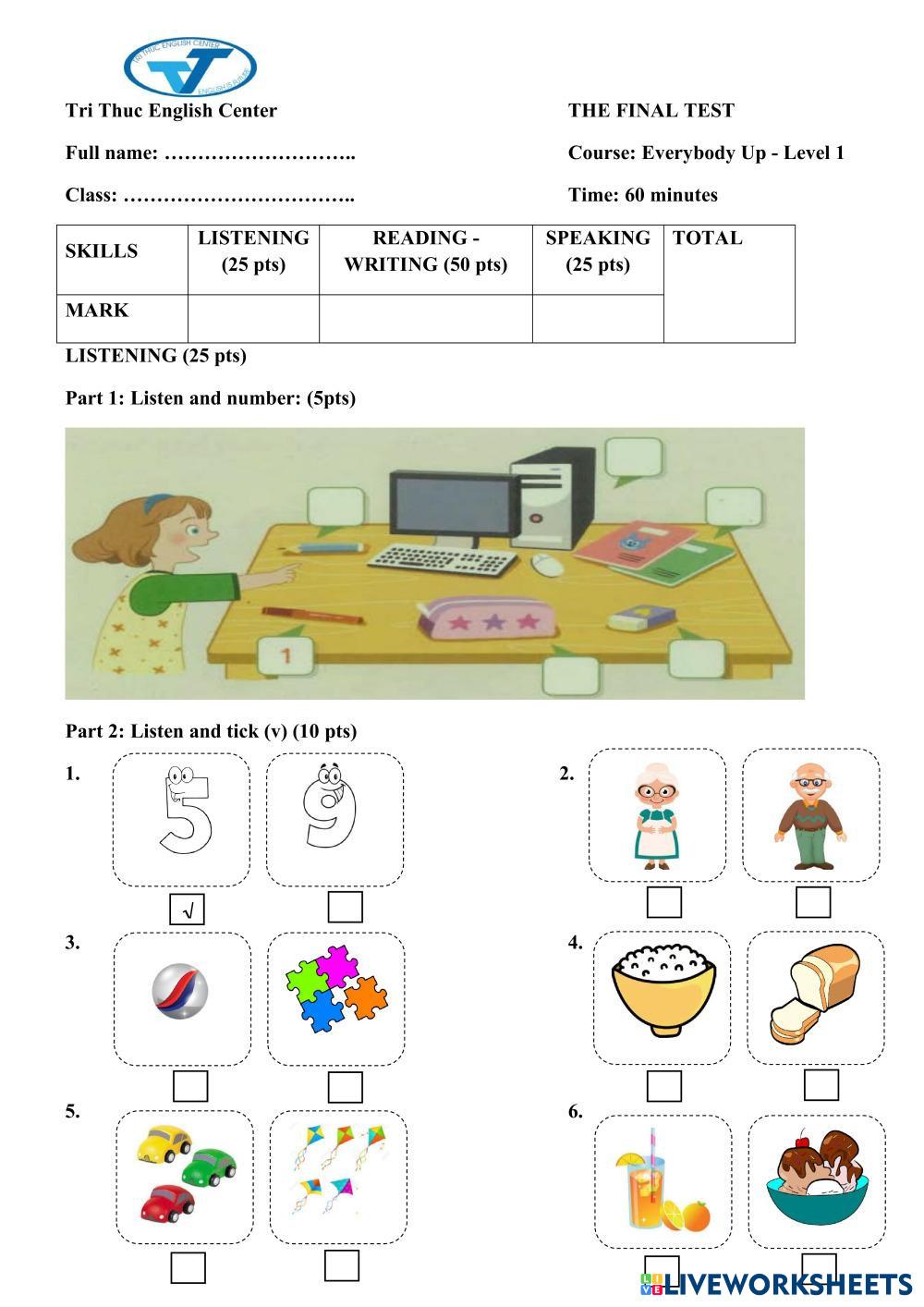 Created byNGUYỄN THỊ QUỲNH NGA Final Test UP 1 Age 6-10 level: UP 1 English Author's Instructions FEFDFADFDSGDFGDFGDSDGGD My Google Classroom Courses × 0 classes selected (0 students total) Quick Access Select all classes (0 classes) All Classes Loading courses... Cancel Share Share to selected Course __COURSE_NAME__ __STUDENT_NAME__ (__STUDENT_EMAIL__) FT_UP1 Download Worksheet Validation Check my answers Emails my answers to my teacher Full name Group/level School subject Teacher's email or key code Close Submit Validating worksheet... (12) Your answers have been sent to your teacher. Good luck! OK We encountered an error submitting your answers. Please try again. OK Advertisement | Go Ad Free Created byNGUYỄN THỊ QUỲNH NGA Final Test UP 1 Age 6-10 level: UP 1 English Author's Instructions FEFDFADFDSGDFGDFGDSDGGD