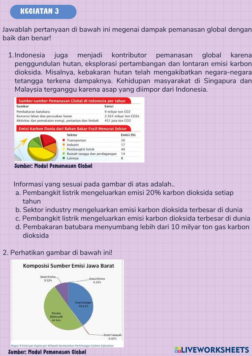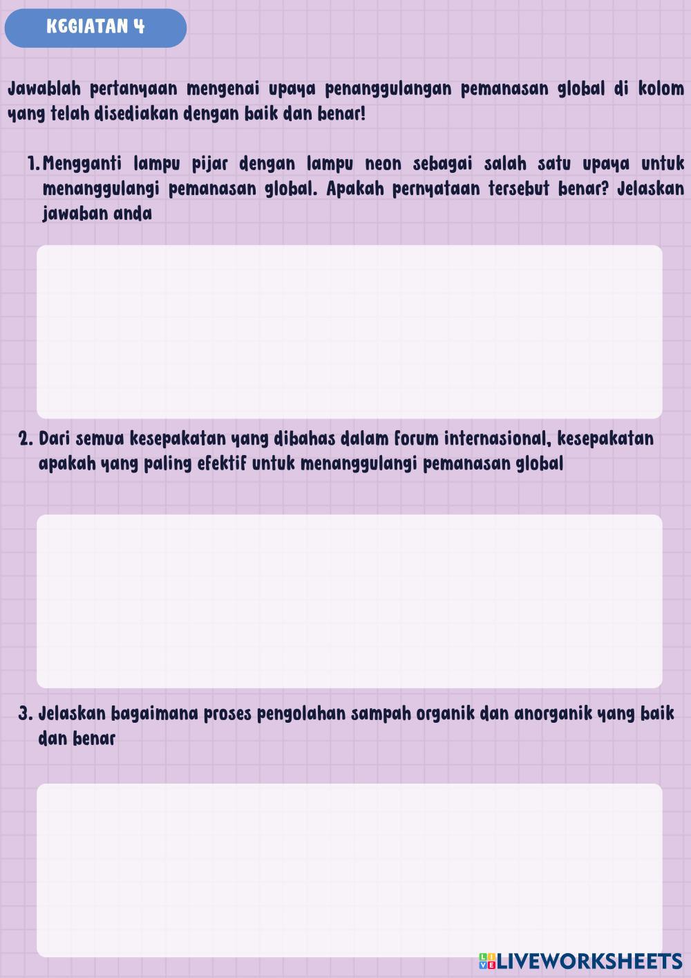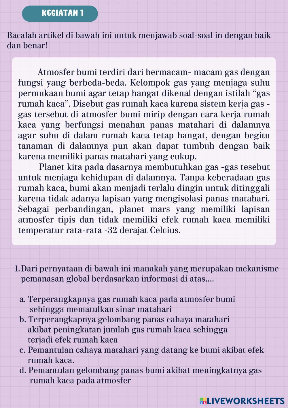 Created byNurul Izzah Fisika Pemanasan Global Age 16+ level: 11 English Author's Instructions My Google Classroom Courses × 0 classes selected (0 students total) Quick Access Select all classes (0 classes) All Classes Loading courses... Cancel Share Share to selected Course __COURSE_NAME__ __STUDENT_NAME__ (__STUDENT_EMAIL__) E-LKPD BERBASIS LIVEWORKSHEET PEMANASAN GLOBAL Download Worksheet Validation Check my answers Emails my answers to my teacher Full name Group/level School subject Teacher's email or key code Close Submit Validating worksheet... (12) Your answers have been sent to your teacher. Good luck! OK We encountered an error submitting your answers. Please try again. OK Advertisement | Go Ad Free Created byNurul Izzah Fisika Pemanasan Global Age 16+ level: 11 English Author's Instructions