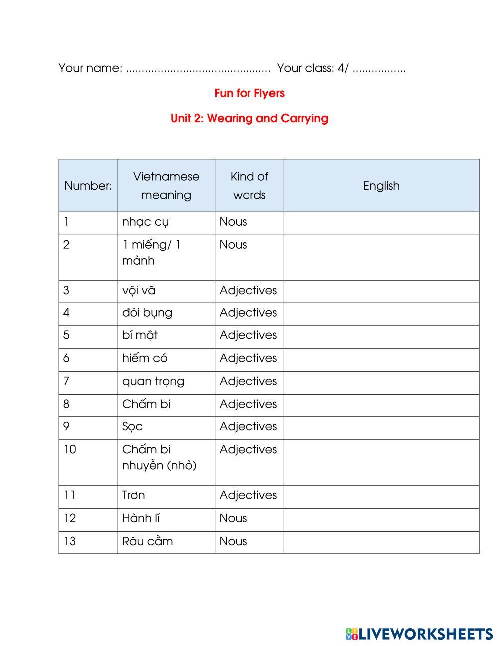 Created byĐinh Thị Phương Trinh Flyers Training Class Review the Vocabulary Unit 3 - FFF Age 9-13 level: 5 English Author's Instructions My Google Classroom Courses × 0 classes selected (0 students total) Quick Access Select all classes (0 classes) All Classes Loading courses... Cancel Share Share to selected Course __COURSE_NAME__ __STUDENT_NAME__ (__STUDENT_EMAIL__) Review the Vocabulary 3.3.25 Download Worksheet Validation Check my answers Emails my answers to my teacher Full name Group/level School subject Teacher's email or key code Close Submit Validating worksheet... (12) Your answers have been sent to your teacher. Good luck! OK We encountered an error submitting your answers. Please try again. OK Advertisement | Go Ad Free Created byĐinh Thị Phương Trinh Flyers Training Class Review the Vocabulary Unit 3 - FFF Age 9-13 level: 5 English Author's Instructions