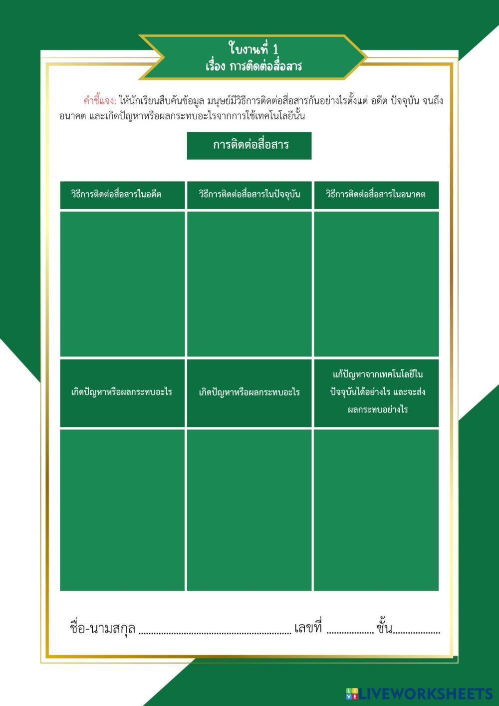 Created byA28AA การติดต่อสื่อสาร การติดต่อสื่อสาร Age 3+ level: 1 Thai Author's Instructions การติดต่อสื่อสาร My Google Classroom Courses × 0 classes selected (0 students total) Quick Access Select all classes (0 classes) All Classes Loading courses... Cancel Share Share to selected Course __COURSE_NAME__ __STUDENT_NAME__ (__STUDENT_EMAIL__) ใบงานที่ 1 เรื่อง การติดต่อสื่อสาร Download Worksheet Validation Check my answers Emails my answers to my teacher Full name Group/level School subject Teacher's email or key code Close Submit Validating worksheet... (12) Your answers have been sent to your teacher. Good luck! OK We encountered an error submitting your answers. Please try again. OK Advertisement | Go Ad Free Created byA28AA การติดต่อสื่อสาร การติดต่อสื่อสาร Age 3+ level: 1 Thai Author's Instructions การติดต่อสื่อสาร