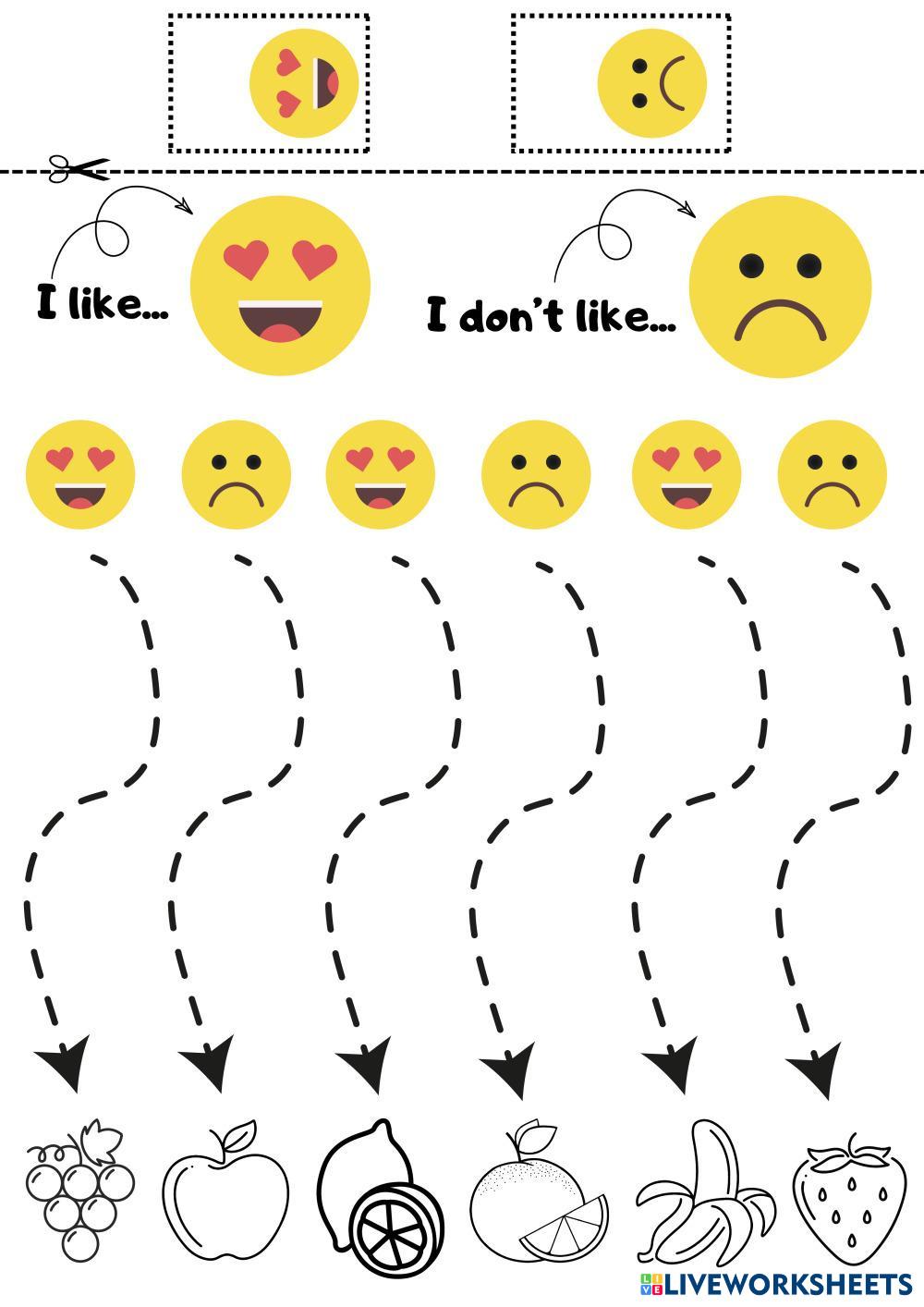 Trace the dotted lines and make a sentence like ''I like grapes'' or ''I don't like lemon.'' etc.