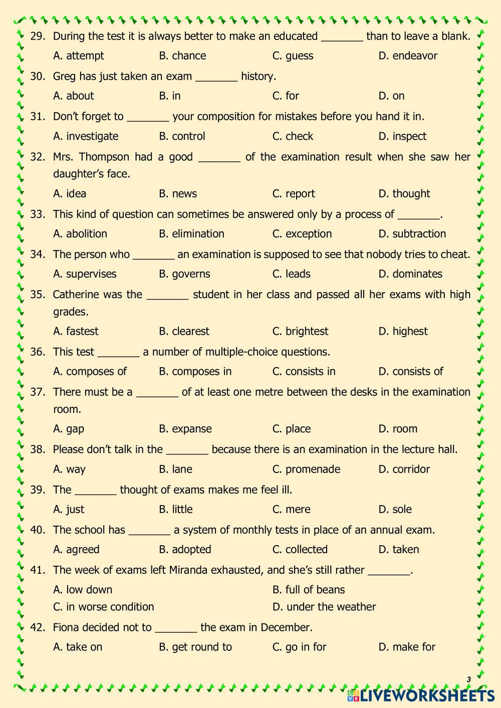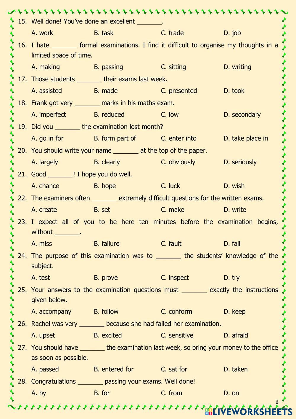Created byNguyễn Thuý Liên Grammar and Vocabulary Correct answers Age 14-15 level: Grade 9 English Author's Instructions My Google Classroom Courses × 0 classes selected (0 students total) Quick Access Select all classes (0 classes) All Classes Loading courses... Cancel Share Share to selected Course __COURSE_NAME__ __STUDENT_NAME__ (__STUDENT_EMAIL__) Vocabulary_Education (Examinations) 7-9 Download Worksheet Validation Check my answers Emails my answers to my teacher Full name Group/level School subject Teacher's email or key code Close Submit Validating worksheet... (12) Your answers have been sent to your teacher. Good luck! OK We encountered an error submitting your answers. Please try again. OK Advertisement | Go Ad Free Created byNguyễn Thuý Liên Grammar and Vocabulary Correct answers Age 14-15 level: Grade 9 English Author's Instructions