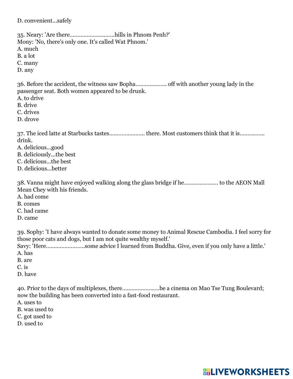 Created by kongrady GRAMMAR AND VOCABULARY GRAMMAR AND VOCABULARY Age 18+ level: INTERMEDIATE English Author's Instructions My Google Classroom Courses × 0 classes selected (0 students total) Quick Access Select all classes (0 classes) All Classes Loading courses... Cancel Share Share to selected Course __COURSE_NAME__ __STUDENT_NAME__ (__STUDENT_EMAIL__) IFL GRAMMAR PRACTICE 2023-2024(1-40) + VOCABULARY Download Worksheet Validation Check my answers Emails my answers to my teacher Full name Group/level School subject Teacher's email or key code Close Submit Validating worksheet... (12) Your answers have been sent to your teacher. Good luck! OK We encountered an error submitting your answers. Please try again. OK Advertisement | Go Ad Free Created by kongrady GRAMMAR AND VOCABULARY GRAMMAR AND VOCABULARY Age 18+ level: INTERMEDIATE English Author's Instructions