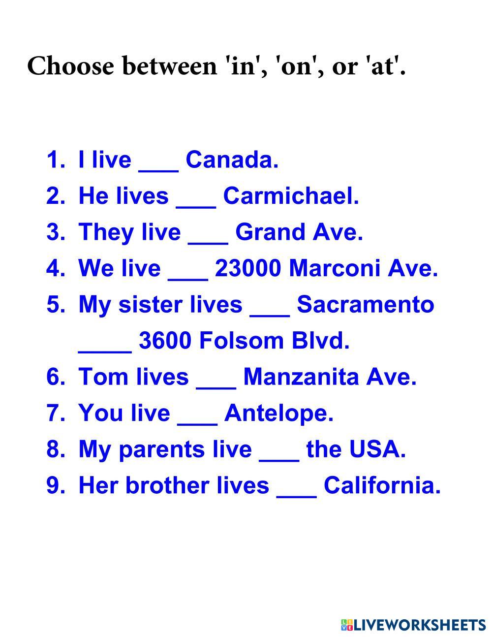 Created byShihee Yu grammar in on at Age 18+ level: 1 English Author's Instructions My Google Classroom Courses × 0 classes selected (0 students total) Quick Access Select all classes (0 classes) All Classes Loading courses... Cancel Share Share to selected Course __COURSE_NAME__ __STUDENT_NAME__ (__STUDENT_EMAIL__) Preposition(place) in, on, at Download Worksheet Validation Check my answers Emails my answers to my teacher Full name Group/level School subject Teacher's email or key code Close Submit Validating worksheet... (12) Your answers have been sent to your teacher. Good luck! OK We encountered an error submitting your answers. Please try again. OK Advertisement | Go Ad Free Created byShihee Yu grammar in on at Age 18+ level: 1 English Author's Instructions