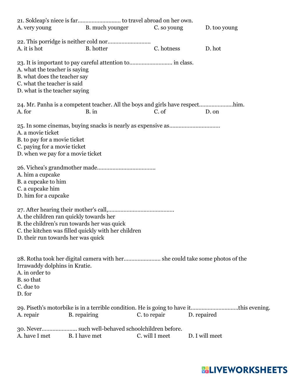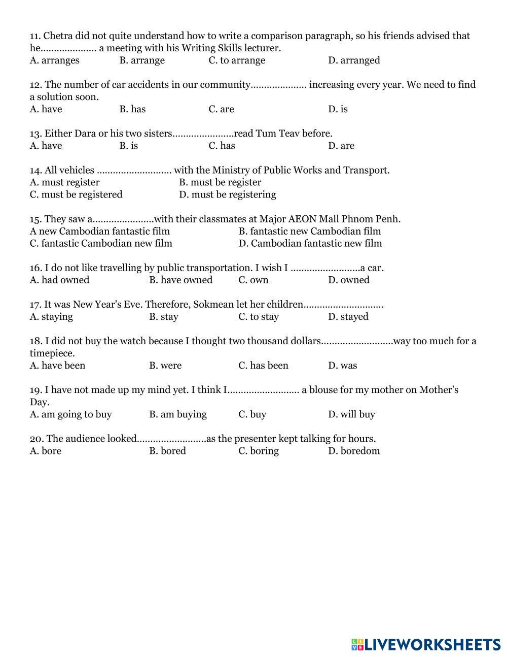 Created by kongrady GRAMMAR GRAMMAR Age 18+ level: INTERMEDIATE English Author's Instructions My Google Classroom Courses × 0 classes selected (0 students total) Quick Access Select all classes (0 classes) All Classes Loading courses... Cancel Share Share to selected Course __COURSE_NAME__ __STUDENT_NAME__ (__STUDENT_EMAIL__) IFL GRAMMAR TEST 2021(1-40) Download Worksheet Validation Check my answers Emails my answers to my teacher Full name Group/level School subject Teacher's email or key code Close Submit Validating worksheet... (12) Your answers have been sent to your teacher. Good luck! OK We encountered an error submitting your answers. Please try again. OK Advertisement | Go Ad Free Created by kongrady GRAMMAR GRAMMAR Age 18+ level: INTERMEDIATE English Author's Instructions