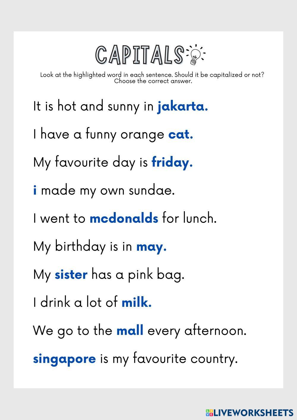 Created by mcesista_tenshi Grammar Capitalization Age 5-13 level: Preschool English Author's Instructions My Google Classroom Courses × 0 classes selected (0 students total) Quick Access Select all classes (0 classes) All Classes Loading courses... Cancel Share Share to selected Course __COURSE_NAME__ __STUDENT_NAME__ (__STUDENT_EMAIL__) Capitalization Download Worksheet Validation Check my answers Emails my answers to my teacher Full name Group/level School subject Teacher's email or key code Close Submit Validating worksheet... (12) Your answers have been sent to your teacher. Good luck! OK We encountered an error submitting your answers. Please try again. OK Advertisement | Go Ad Free Created by mcesista_tenshi Grammar Capitalization Age 5-13 level: Preschool English Author's Instructions
