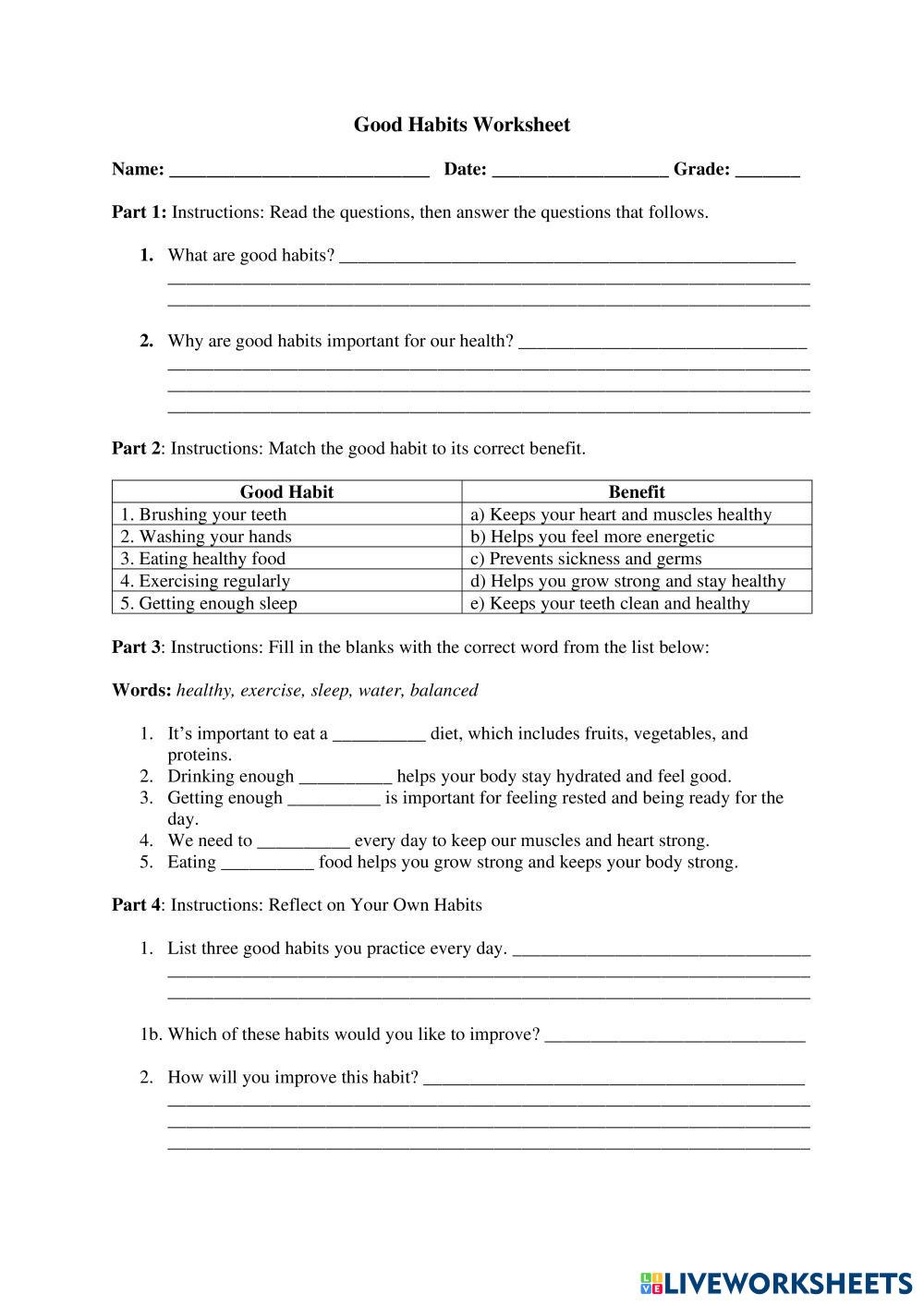 Created byC. Henry Health and Family Life Good Habits for a Healthy Life Age 9-15 level: 2 English Author's Instructions My Google Classroom Courses × 0 classes selected (0 students total) Quick Access Select all classes (0 classes) All Classes Loading courses... Cancel Share Share to selected Course __COURSE_NAME__ __STUDENT_NAME__ (__STUDENT_EMAIL__) Good Habits Download Worksheet Validation Check my answers Emails my answers to my teacher Full name Group/level School subject Teacher's email or key code Close Submit Validating worksheet... (12) Your answers have been sent to your teacher. Good luck! OK We encountered an error submitting your answers. Please try again. OK Advertisement | Go Ad Free Created byC. Henry Health and Family Life Good Habits for a Healthy Life Age 9-15 level: 2 English Author's Instructions