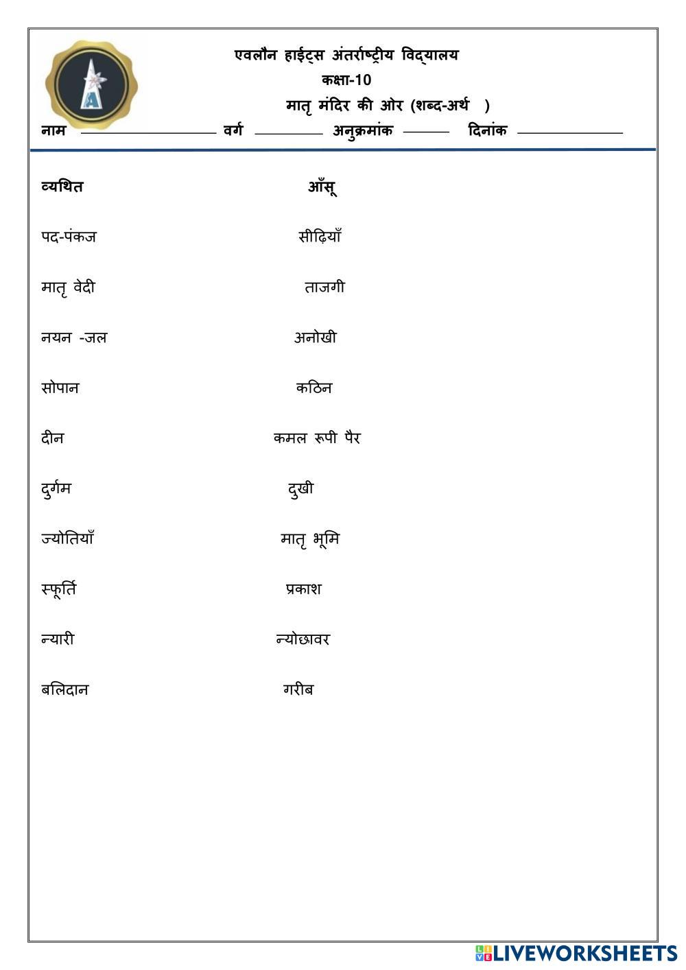 Created bygarvita kapoor Hindi Worksheet Age 12-17 level: Grade 10 English Author's Instructions My Google Classroom Courses × 0 classes selected (0 students total) Quick Access Select all classes (0 classes) All Classes Loading courses... Cancel Share Share to selected Course __COURSE_NAME__ __STUDENT_NAME__ (__STUDENT_EMAIL__) मातृ मंदिर की ओर Download Worksheet Validation Check my answers Emails my answers to my teacher Full name Group/level School subject Teacher's email or key code Close Submit Validating worksheet... (12) Your answers have been sent to your teacher. Good luck! OK We encountered an error submitting your answers. Please try again. OK Advertisement | Go Ad Free Created bygarvita kapoor Hindi Worksheet Age 12-17 level: Grade 10 English Author's Instructions