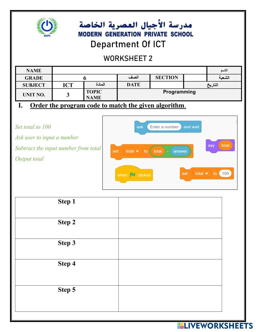 Created by rimaashik ICT 2 Programming Age 7-18 level: Grade 6 English Author's Instructions My Google Classroom Courses × 0 classes selected (0 students total) Quick Access Select all classes (0 classes) All Classes Loading courses... Cancel Share Share to selected Course __COURSE_NAME__ __STUDENT_NAME__ (__STUDENT_EMAIL__) Unit 3 - ICT Grade 6 Download Worksheet Validation Check my answers Emails my answers to my teacher Full name Group/level School subject Teacher's email or key code Close Submit Validating worksheet... (12) Your answers have been sent to your teacher. Good luck! OK We encountered an error submitting your answers. Please try again. OK Advertisement | Go Ad Free Created by rimaashik ICT 2 Programming Age 7-18 level: Grade 6 English Author's Instructions