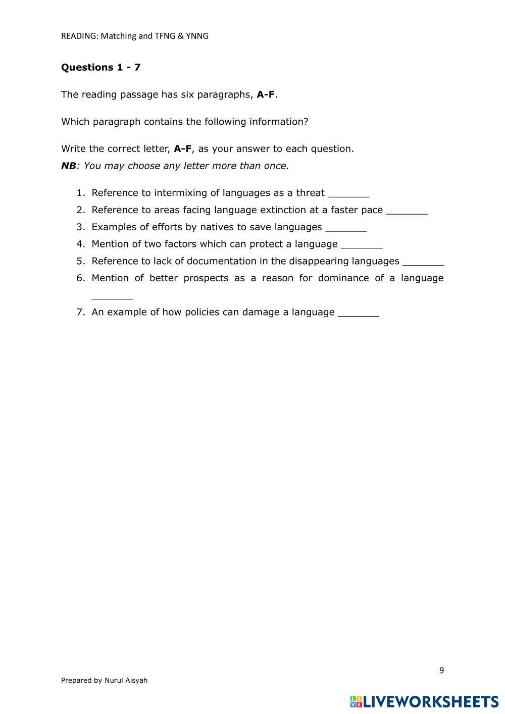 Created byAisyah IELTS Reading T/F/NG Age 15+ level: IELTS English Author's Instructions My Google Classroom Courses × 0 classes selected (0 students total) Quick Access Select all classes (0 classes) All Classes Loading courses... Cancel Share Share to selected Course __COURSE_NAME__ __STUDENT_NAME__ (__STUDENT_EMAIL__) Matching question and TFNG YNNG Download Worksheet Validation Check my answers Emails my answers to my teacher Full name Group/level School subject Teacher's email or key code Close Submit Validating worksheet... (12) Your answers have been sent to your teacher. Good luck! OK We encountered an error submitting your answers. Please try again. OK Advertisement | Go Ad Free Created byAisyah IELTS Reading T/F/NG Age 15+ level: IELTS English Author's Instructions