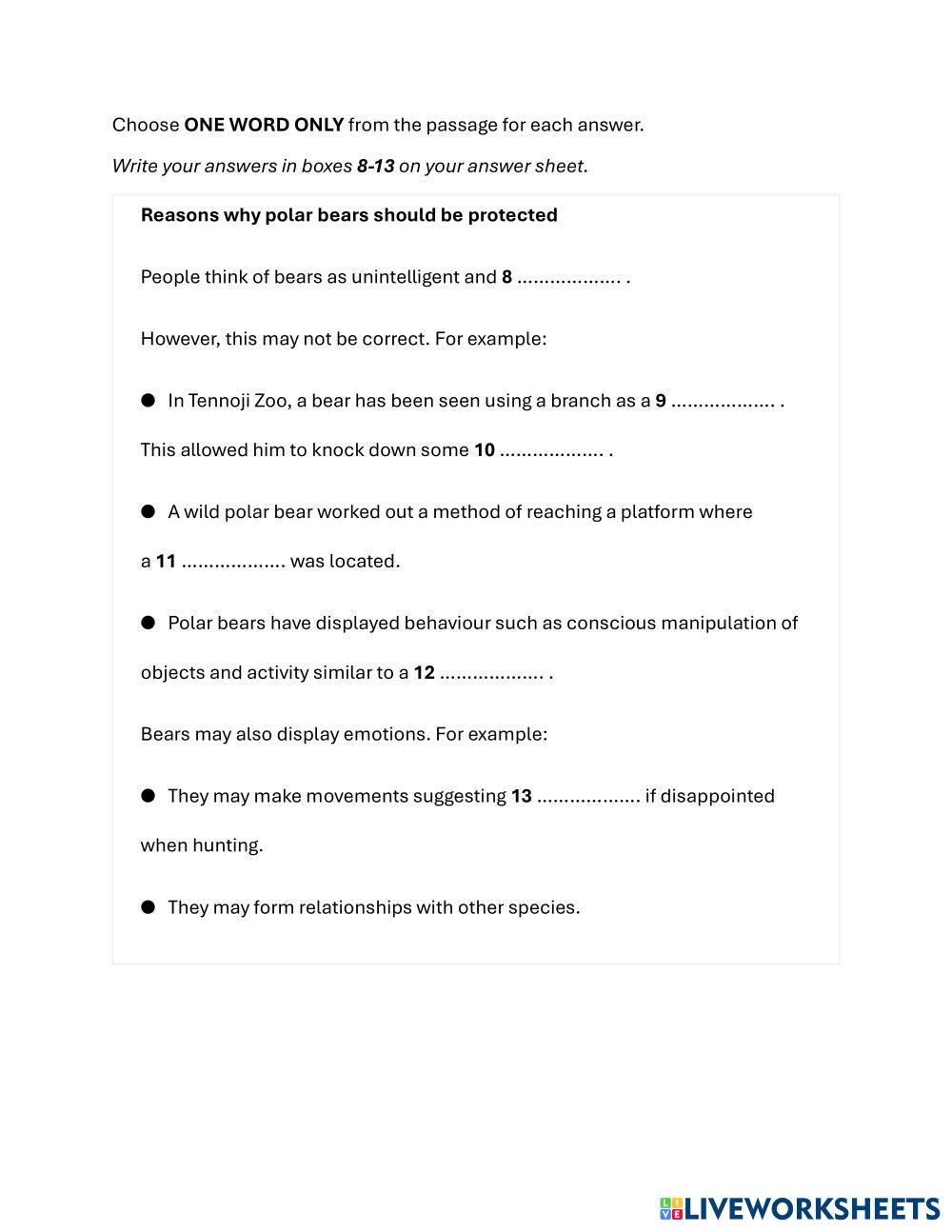 Created byLinh Dang IELTS Final Mini test - PREF Age 10+ level: Pre Foundation English Author's Instructions My Google Classroom Courses × 0 classes selected (0 students total) Quick Access Select all classes (0 classes) All Classes Loading courses... Cancel Share Share to selected Course __COURSE_NAME__ __STUDENT_NAME__ (__STUDENT_EMAIL__) Final Mini test - PREF Download Worksheet Validation Check my answers Emails my answers to my teacher Full name Group/level School subject Teacher's email or key code Close Submit Validating worksheet... (12) Your answers have been sent to your teacher. Good luck! OK We encountered an error submitting your answers. Please try again. OK Advertisement | Go Ad Free Created byLinh Dang IELTS Final Mini test - PREF Age 10+ level: Pre Foundation English Author's Instructions