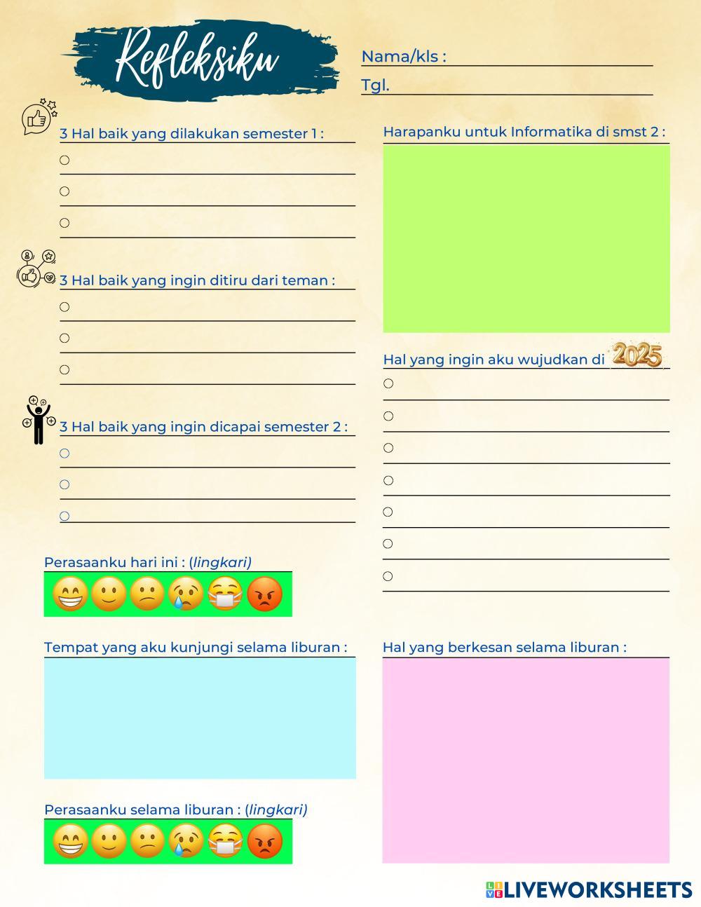 Created by Sri_Darmaningsih informatica Assesmen Age 15+ level: 10-12 English Author's Instructions My Google Classroom Courses × 0 classes selected (0 students total) Quick Access Select all classes (0 classes) All Classes Loading courses... Cancel Share Share to selected Course __COURSE_NAME__ __STUDENT_NAME__ (__STUDENT_EMAIL__) Refleksiku Download Worksheet Validation Check my answers Emails my answers to my teacher Full name Group/level School subject Teacher's email or key code Close Submit Validating worksheet... (12) Your answers have been sent to your teacher. Good luck! OK We encountered an error submitting your answers. Please try again. OK Advertisement | Go Ad Free Created by Sri_Darmaningsih informatica Assesmen Age 15+ level: 10-12 English Author's Instructions