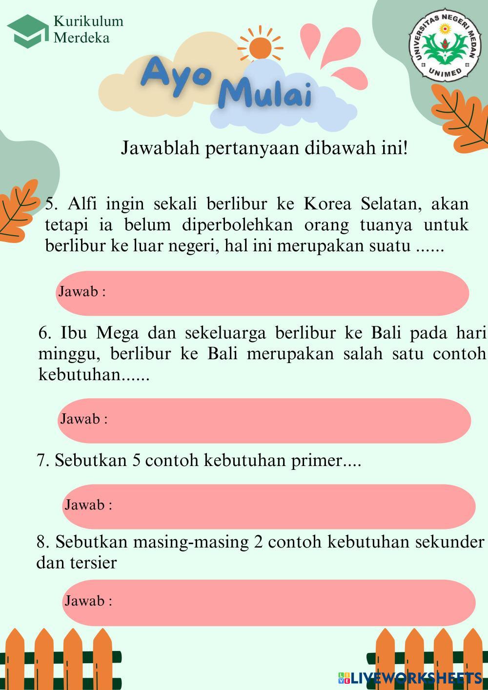Created bySalsanabila Harahap IPAS Ilmu pengetahuan sosial Age 9-14 level: 4 English Author's Instructions My Google Classroom Courses × 0 classes selected (0 students total) Quick Access Select all classes (0 classes) All Classes Loading courses... Cancel Share Share to selected Course __COURSE_NAME__ __STUDENT_NAME__ (__STUDENT_EMAIL__) AKU DAN KEBUTUHANKU LIVEWORKSHEET Download Worksheet Validation Check my answers Emails my answers to my teacher Full name Group/level School subject Teacher's email or key code Close Submit Validating worksheet... (12) Your answers have been sent to your teacher. Good luck! OK We encountered an error submitting your answers. Please try again. OK Advertisement | Go Ad Free Created bySalsanabila Harahap IPAS Ilmu pengetahuan sosial Age 9-14 level: 4 English Author's Instructions