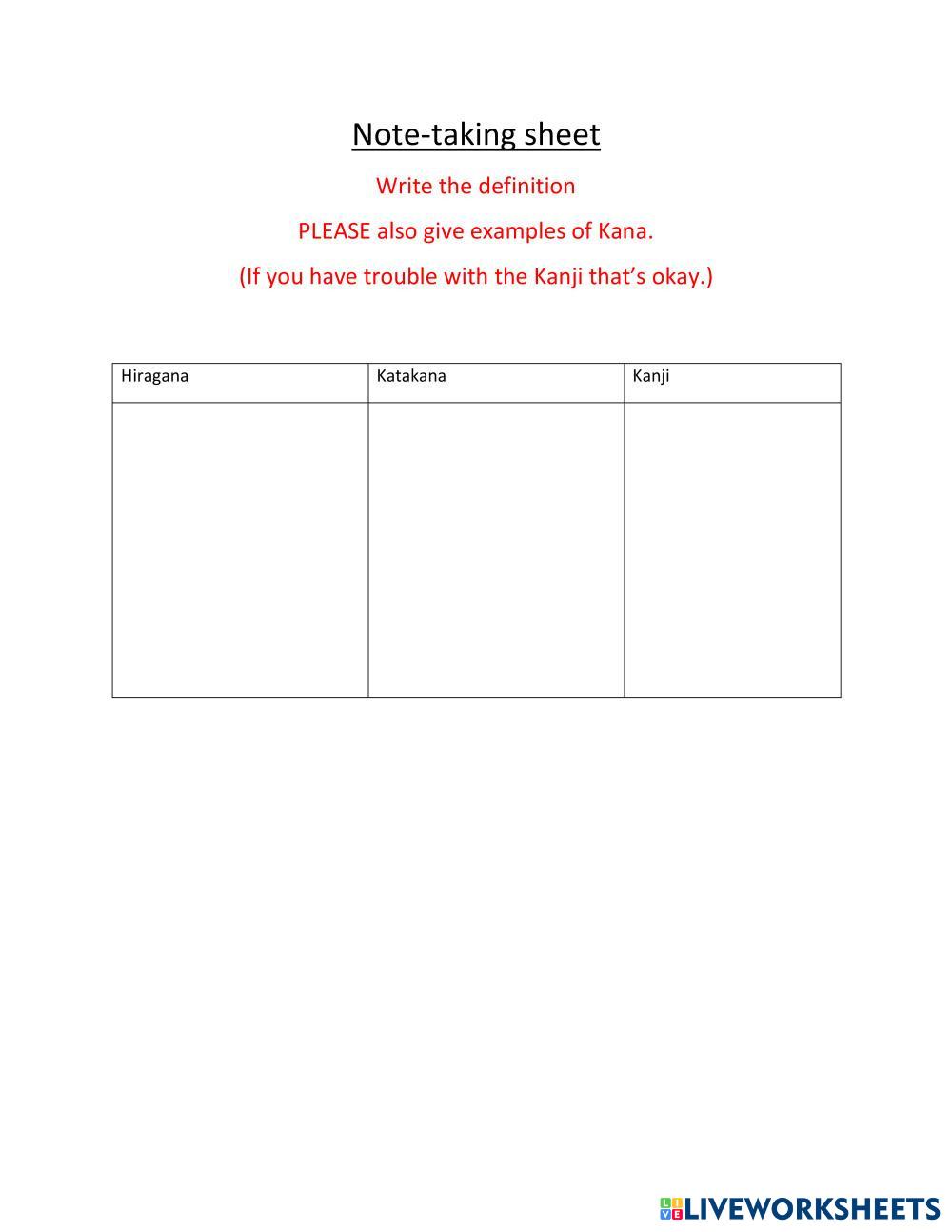 Created byKaleb Sims Japanese writing Age 10+ level: beginner English Author's Instructions My Google Classroom Courses × 0 classes selected (0 students total) Quick Access Select all classes (0 classes) All Classes Loading courses... Cancel Share Share to selected Course __COURSE_NAME__ __STUDENT_NAME__ (__STUDENT_EMAIL__) Kana Notes Worksheet Download Worksheet Validation Check my answers Emails my answers to my teacher Full name Group/level School subject Teacher's email or key code Close Submit Validating worksheet... (12) Your answers have been sent to your teacher. Good luck! OK We encountered an error submitting your answers. Please try again. OK Advertisement | Go Ad Free Created byKaleb Sims Japanese writing Age 10+ level: beginner English Author's Instructions
