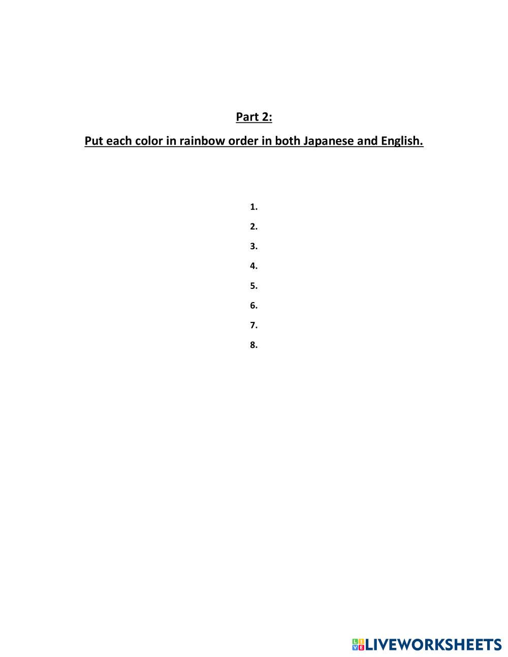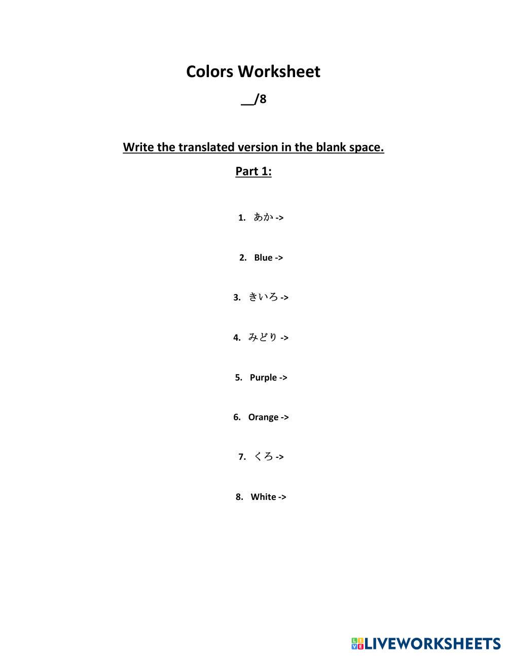Created byKaleb Sims Japanese Vocabulary Age 14+ level: beginner English Author's Instructions My Google Classroom Courses × 0 classes selected (0 students total) Quick Access Select all classes (0 classes) All Classes Loading courses... Cancel Share Share to selected Course __COURSE_NAME__ __STUDENT_NAME__ (__STUDENT_EMAIL__) Colors Worksheet Download Worksheet Validation Check my answers Emails my answers to my teacher Full name Group/level School subject Teacher's email or key code Close Submit Validating worksheet... (12) Your answers have been sent to your teacher. Good luck! OK We encountered an error submitting your answers. Please try again. OK Advertisement | Go Ad Free Created byKaleb Sims Japanese Vocabulary Age 14+ level: beginner English Author's Instructions