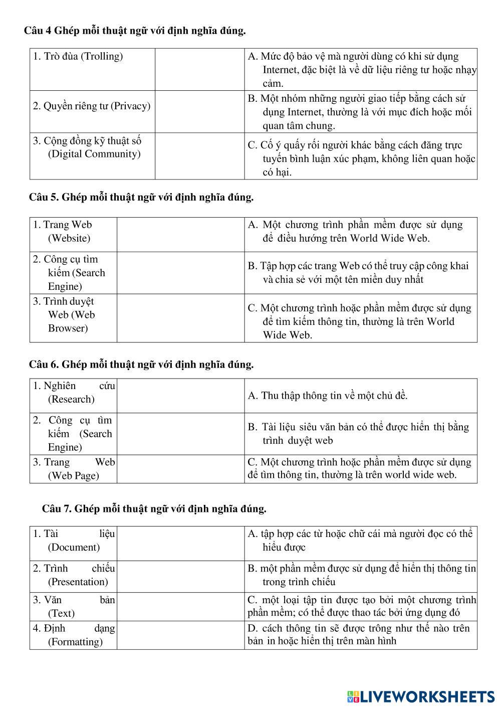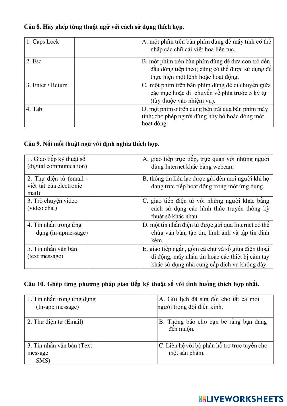 Created byLê Anh Phương join: Join: Age 8-13 level: 1 English Author's Instructions My Google Classroom Courses × 0 classes selected (0 students total) Quick Access Select all classes (0 classes) All Classes Loading courses... Cancel Share Share to selected Course __COURSE_NAME__ __STUDENT_NAME__ (__STUDENT_EMAIL__) BÀI TẬP ÔN THI TIN HỌC Download Worksheet Validation Check my answers Emails my answers to my teacher Full name Group/level School subject Teacher's email or key code Close Submit Validating worksheet... (12) Your answers have been sent to your teacher. Good luck! OK We encountered an error submitting your answers. Please try again. OK Advertisement | Go Ad Free Created byLê Anh Phương join: Join: Age 8-13 level: 1 English Author's Instructions