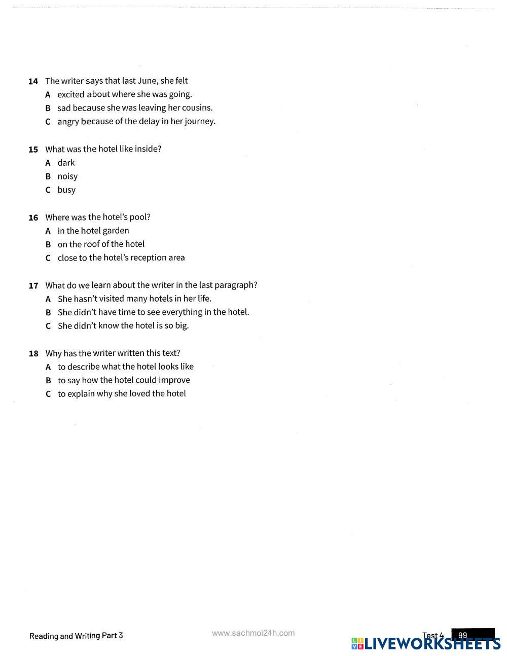 Created byNguyễn Tấn Phúc KET KET Age 9+ level: KET English Author's Instructions My Google Classroom Courses × 0 classes selected (0 students total) Quick Access Select all classes (0 classes) All Classes Loading courses... Cancel Share Share to selected Course __COURSE_NAME__ __STUDENT_NAME__ (__STUDENT_EMAIL__) KET A (R&W 3) Download Worksheet Validation Check my answers Emails my answers to my teacher Full name Group/level School subject Teacher's email or key code Close Submit Validating worksheet... (12) Your answers have been sent to your teacher. Good luck! OK We encountered an error submitting your answers. Please try again. OK Advertisement | Go Ad Free Created byNguyễn Tấn Phúc KET KET Age 9+ level: KET English Author's Instructions