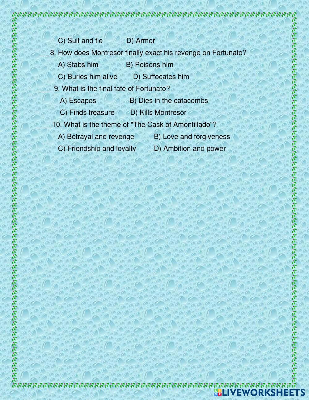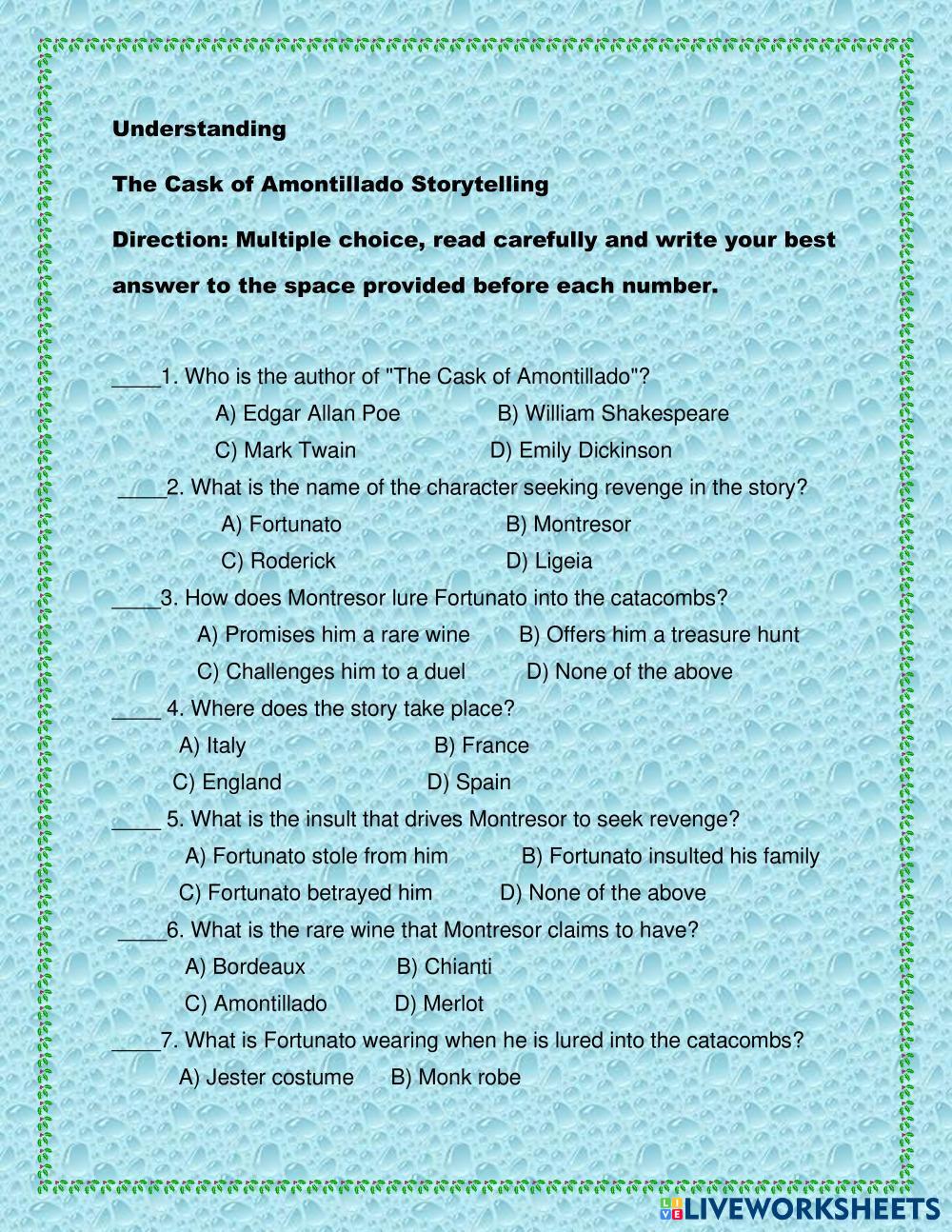 Created byGracila Yroila letters English Age 13-17 level: Grade 7. English Author's Instructions choosing the suitable answer My Google Classroom Courses × 0 classes selected (0 students total) Quick Access Select all classes (0 classes) All Classes Loading courses... Cancel Share Share to selected Course __COURSE_NAME__ __STUDENT_NAME__ (__STUDENT_EMAIL__) Multiple choice Download Worksheet Validation Check my answers Emails my answers to my teacher Full name Group/level School subject Teacher's email or key code Close Submit Validating worksheet... (12) Your answers have been sent to your teacher. Good luck! OK We encountered an error submitting your answers. Please try again. OK Advertisement | Go Ad Free Created byGracila Yroila letters English Age 13-17 level: Grade 7. English Author's Instructions choosing the suitable answer