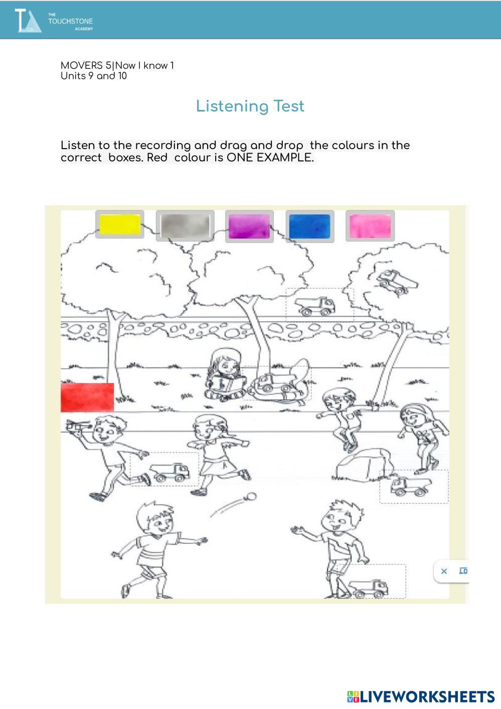 Created byThe Touchstone Academy Listening Comprehension Listening Comprehension Age 5-14 level: Movers 5 English Author's Instructions My Google Classroom Courses × 0 classes selected (0 students total) Quick Access Select all classes (0 classes) All Classes Loading courses... Cancel Share Share to selected Course __COURSE_NAME__ __STUDENT_NAME__ (__STUDENT_EMAIL__) Movers 5 Listening Test Download Worksheet Validation Check my answers Emails my answers to my teacher Full name Group/level School subject Teacher's email or key code Close Submit Validating worksheet... (12) Your answers have been sent to your teacher. Good luck! OK We encountered an error submitting your answers. Please try again. OK Advertisement | Go Ad Free Created byThe Touchstone Academy Listening Comprehension Listening Comprehension Age 5-14 level: Movers 5 English Author's Instructions