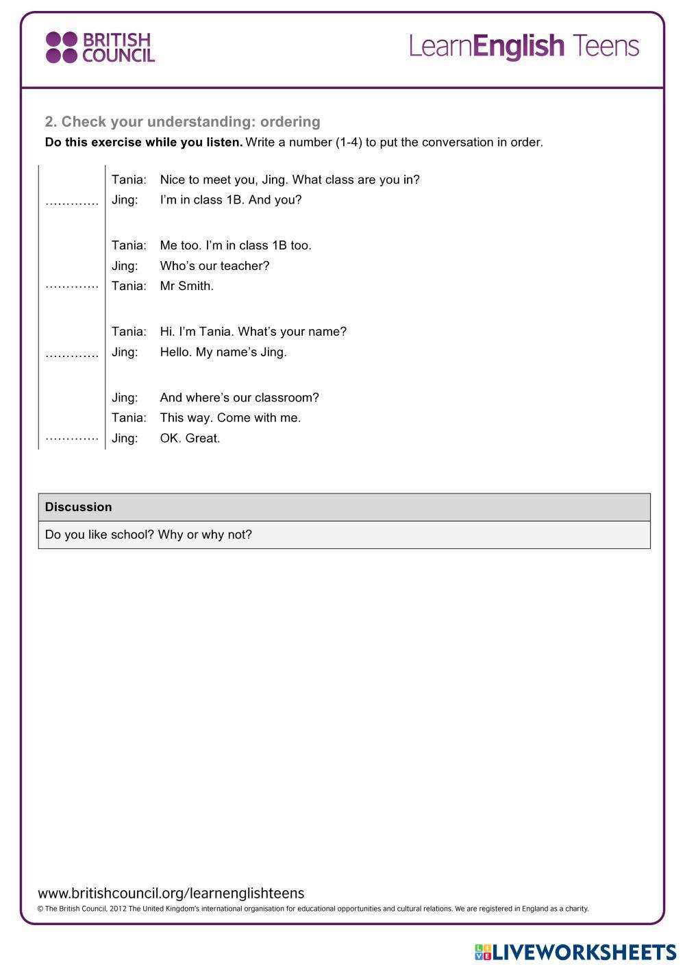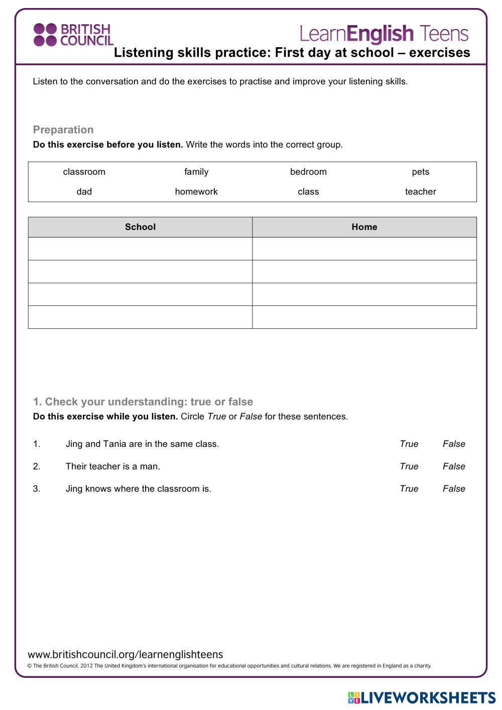 Created by Sveta99 Listening Comprehension school day Age 12-16 level: A1 English Author's Instructions My Google Classroom Courses × 0 classes selected (0 students total) Quick Access Select all classes (0 classes) All Classes Loading courses... Cancel Share Share to selected Course __COURSE_NAME__ __STUDENT_NAME__ (__STUDENT_EMAIL__) British council teens Download Worksheet Validation Check my answers Emails my answers to my teacher Full name Group/level School subject Teacher's email or key code Close Submit Validating worksheet... (12) Your answers have been sent to your teacher. Good luck! OK We encountered an error submitting your answers. Please try again. OK Advertisement | Go Ad Free Created by Sveta99 Listening Comprehension school day Age 12-16 level: A1 English Author's Instructions