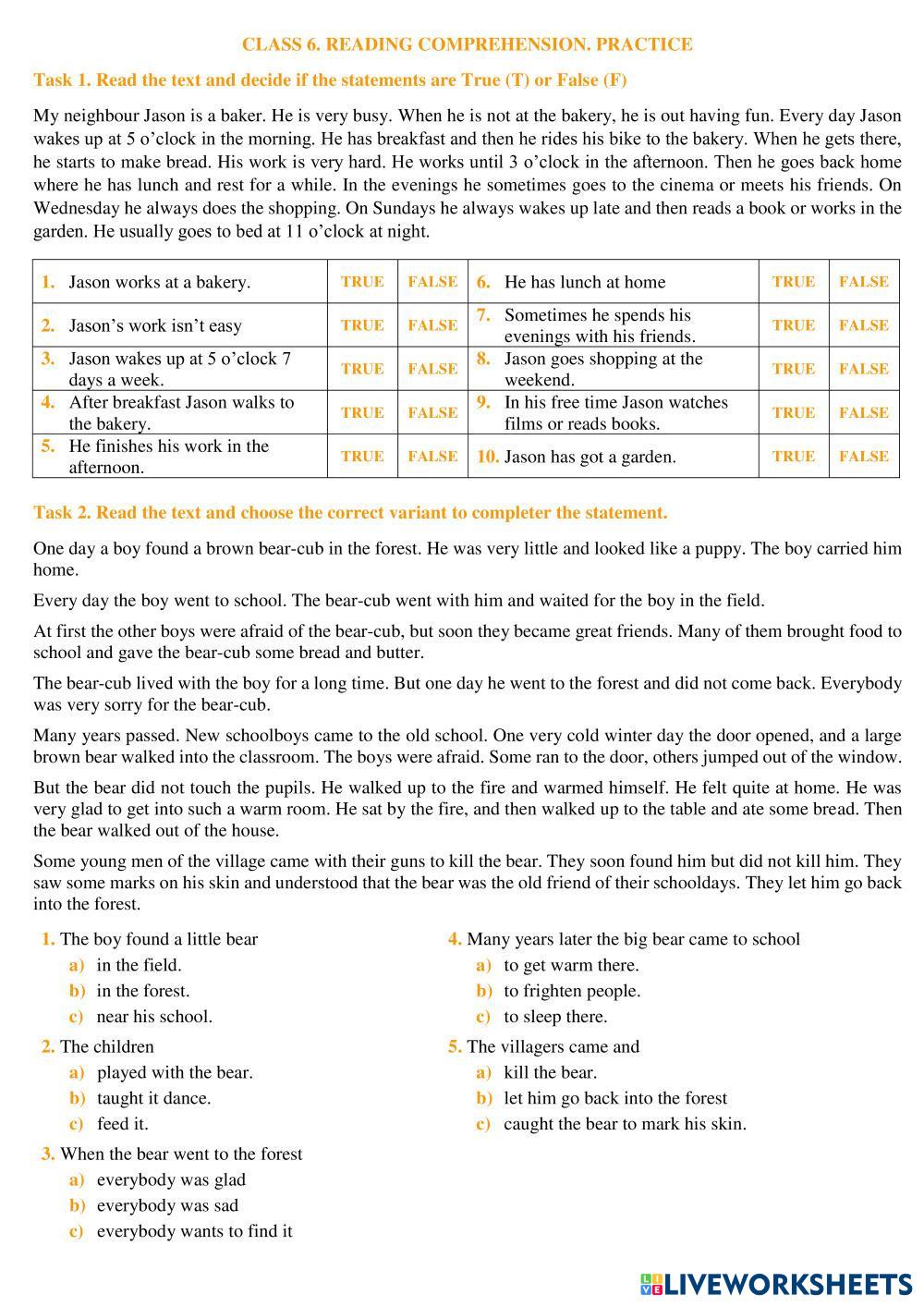 Two texts for reading-comprehensio and two tasks: True or False and Multiple choice