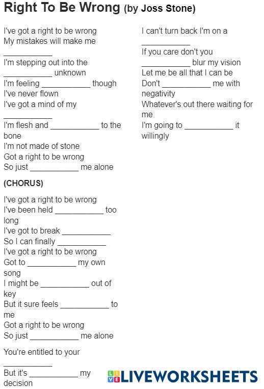 Created by kzasnicoff Listening - Song Song Worksheet ESL Age 15+ level: B1-B2 English Author's Instructions My Google Classroom Courses × 0 classes selected (0 students total) Quick Access Select all classes (0 classes) All Classes Loading courses... Cancel Share Share to selected Course __COURSE_NAME__ __STUDENT_NAME__ (__STUDENT_EMAIL__) RIGHT TO BE WRONG - Joss Stone Download Worksheet Validation Check my answers Emails my answers to my teacher Full name Group/level School subject Teacher's email or key code Close Submit Validating worksheet... (12) Your answers have been sent to your teacher. Good luck! OK We encountered an error submitting your answers. Please try again. OK Advertisement | Go Ad Free Created by kzasnicoff Listening - Song Song Worksheet ESL Age 15+ level: B1-B2 English Author's Instructions