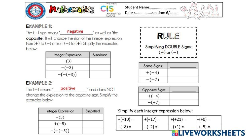 Created byRASHA ISSAM SHATAT Math Middle School 6th grade Algebra English Author's Instructions Grade 6 Math My Google Classroom Courses × 0 classes selected (0 students total) Quick Access Select all classes (0 classes) All Classes Loading courses... Cancel Share Share to selected Course __COURSE_NAME__ __STUDENT_NAME__ (__STUDENT_EMAIL__) Integers Download Worksheet Validation Check my answers Emails my answers to my teacher Full name Group/level School subject Teacher's email or key code Close Submit Validating worksheet... (12) Your answers have been sent to your teacher. Good luck! OK We encountered an error submitting your answers. Please try again. OK Advertisement | Go Ad Free Created byRASHA ISSAM SHATAT Math Middle School 6th grade Algebra English Author's Instructions Grade 6 Math Explore Worksheets Operaciones en N Math 6th grade Operaciones en N Algebra - Math Completar Ecuaciones de primer grado Math 6th grade Ecuaciones de primer grado Algebra - Math Ecuaciones de primer grado ورقة عمل قواعد الدوال Math 6th grade ورقة عمل قواعد الدوال Algebra - Math . Solving One Step Equations Math 6th grade Solving One Step Equations Algebra - Math Solve one step algebra equations