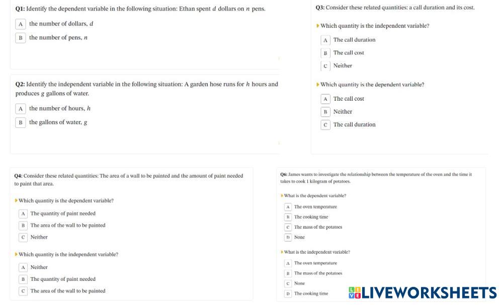 Created byAbiramisundari Dhanasekara Dhandapani Math Middle School 6th grade Algebra English Author's Instructions Choose the correct answer. My Google Classroom Courses × 0 classes selected (0 students total) Quick Access Select all classes (0 classes) All Classes Loading courses... Cancel Share Share to selected Course __COURSE_NAME__ __STUDENT_NAME__ (__STUDENT_EMAIL__) Dependent and Independent Variables Download Worksheet Validation Check my answers Emails my answers to my teacher Full name Group/level School subject Teacher's email or key code Close Submit Validating worksheet... (12) Your answers have been sent to your teacher. Good luck! OK We encountered an error submitting your answers. Please try again. OK Advertisement | Go Ad Free Created byAbiramisundari Dhanasekara Dhandapani Math Middle School 6th grade Algebra English Author's Instructions Choose the correct answer. Explore Worksheets M7L1 - Exit Ticket Math 6th grade M7L1 - Exit Ticket Algebra - Math Fill the table with the correct answers Дроби Math 6th grade Дроби Algebra - Math Рабочий лист Дроби Math 6th grade Дроби Algebra - Math Интерактиный лист Graphs of Relationships Math 6th grade Graphs of Relationships Algebra - Math fill in the blanks