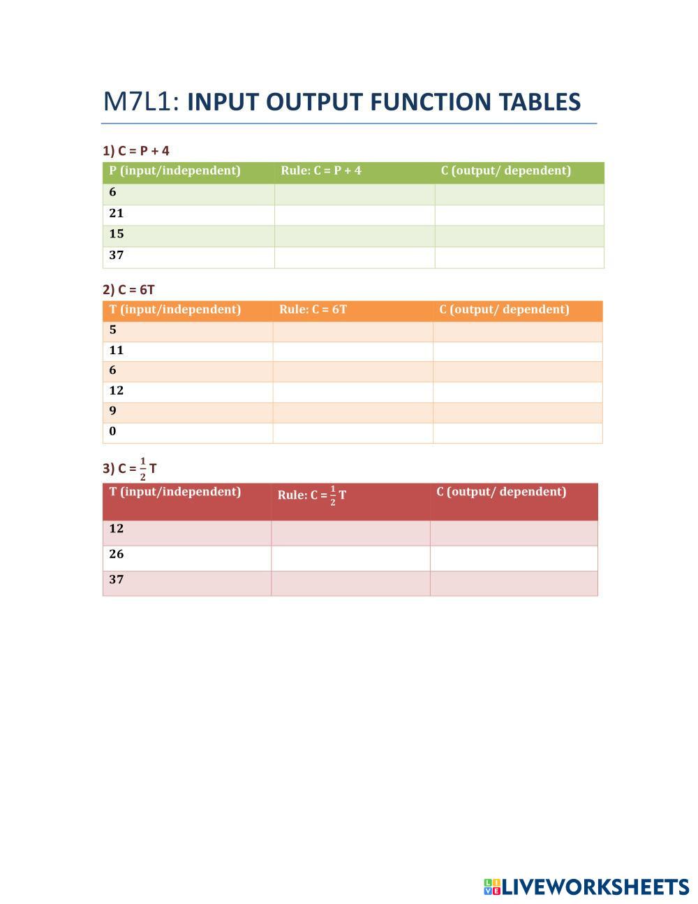 Created by arwamusa Math Middle School 6th grade Algebra English Author's Instructions Fill in the blanks. My Google Classroom Courses × 0 classes selected (0 students total) Quick Access Select all classes (0 classes) All Classes Loading courses... Cancel Share Share to selected Course __COURSE_NAME__ __STUDENT_NAME__ (__STUDENT_EMAIL__) Relationship between two variables Download Worksheet Validation Check my answers Emails my answers to my teacher Full name Group/level School subject Teacher's email or key code Close Submit Validating worksheet... (12) Your answers have been sent to your teacher. Good luck! OK We encountered an error submitting your answers. Please try again. OK Advertisement | Go Ad Free Created by arwamusa Math Middle School 6th grade Algebra English Author's Instructions Fill in the blanks. Explore Worksheets 🐒 Mission: The Monkey’s Stash & The Parrot’s Nest! Math 6th grade 🐒 Mission: The Monkey’s Stash & The Parrot’s Nest! Algebra - Math Solve the mysteries! EMAT 6è divisors Math 6th grade EMAT 6è divisors Algebra - Math Encerta la resposta correcta التمثيل البياني للدوال Math 6th grade التمثيل البياني للدوال Algebra - Math اوجد Complete the function table Math 6th grade Complete the function table Algebra - Math Find the missing output values and write the rule.