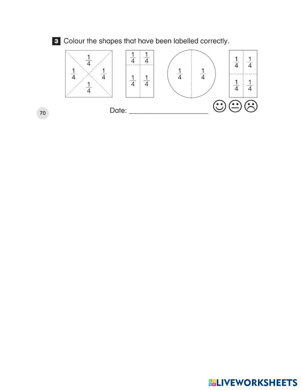 Colour the shapes that are divided into quarters. Then label each quarter 1/4.