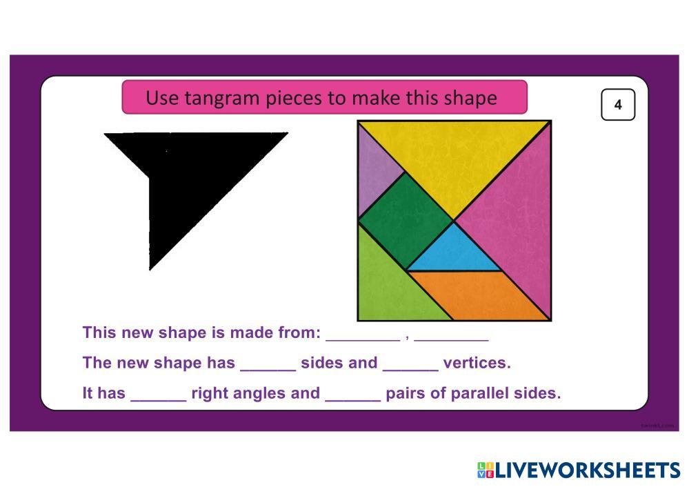 Created byNguyễn Thị Ái Linh Math Elementary 2nd grade Geometry English Author's Instructions Describe about new shape My Google Classroom Courses × 0 classes selected (0 students total) Quick Access Select all classes (0 classes) All Classes Loading courses... Cancel Share Share to selected Course __COURSE_NAME__ __STUDENT_NAME__ (__STUDENT_EMAIL__) 2D shapes - tangram Download Worksheet Validation Check my answers Emails my answers to my teacher Full name Group/level School subject Teacher's email or key code Close Submit Validating worksheet... (12) Your answers have been sent to your teacher. Good luck! OK We encountered an error submitting your answers. Please try again. OK Advertisement | Go Ad Free Created byNguyễn Thị Ái Linh Math Elementary 2nd grade Geometry English Author's Instructions Describe about new shape Explore Worksheets SECUENCIAS Y CONJUNTOS Math 2nd grade SECUENCIAS Y CONJUNTOS Geometry - Math Seleccione la respuesta correcta. Naming 2-Dimensional Shapes Math 2nd grade Naming 2-Dimensional Shapes Geometry - Math Match the shape with the correct name. Khối cầu - Khối trụ Math 2nd grade Khối cầu - Khối trụ Geometry - Math Nối tên phù hợp với các hình tương ứng. Seriaciones Geométricas - 2do grado de primaria - Miss Jessica Godoy Math 2nd grade Seriaciones Geométricas - 2do grado de primaria - Miss Jessica Godoy Geometry - Math Lee atentamente y resuelve según lo que se te indica.