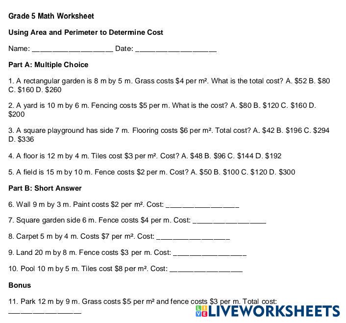 Created byEMMANUEL EKHAMEYE Math Elementary 5th grade Geometry English Author's Instructions Kindly fill the boxes with the right answer My Google Classroom Courses × 0 classes selected (0 students total) Quick Access Select all classes (0 classes) All Classes Loading courses... Cancel Share Share to selected Course __COURSE_NAME__ __STUDENT_NAME__ (__STUDENT_EMAIL__) Using Area and Perimeter to Determine Cost Download Worksheet Validation Check my answers Emails my answers to my teacher Full name Group/level School subject Teacher's email or key code Close Submit Validating worksheet... (12) Your answers have been sent to your teacher. Good luck! OK We encountered an error submitting your answers. Please try again. OK Advertisement | Go Ad Free Created byEMMANUEL EKHAMEYE Math Elementary 5th grade Geometry English Author's Instructions Kindly fill the boxes with the right answer Explore Worksheets Area and Perimeter Math 5th grade Area and Perimeter Geometry - Math Area and perimeter Bài kiểm tra cuối tuần Math 5th grade Bài kiểm tra cuối tuần Geometry - Math Lựa chọn đáp án đúng Bài tập 1 Math 5th grade Bài tập 1 Geometry - Math Chọn đáp án đúng Bài tập 1 Math 5th grade Bài tập 1 Geometry - Math Chọn đáp án đúng