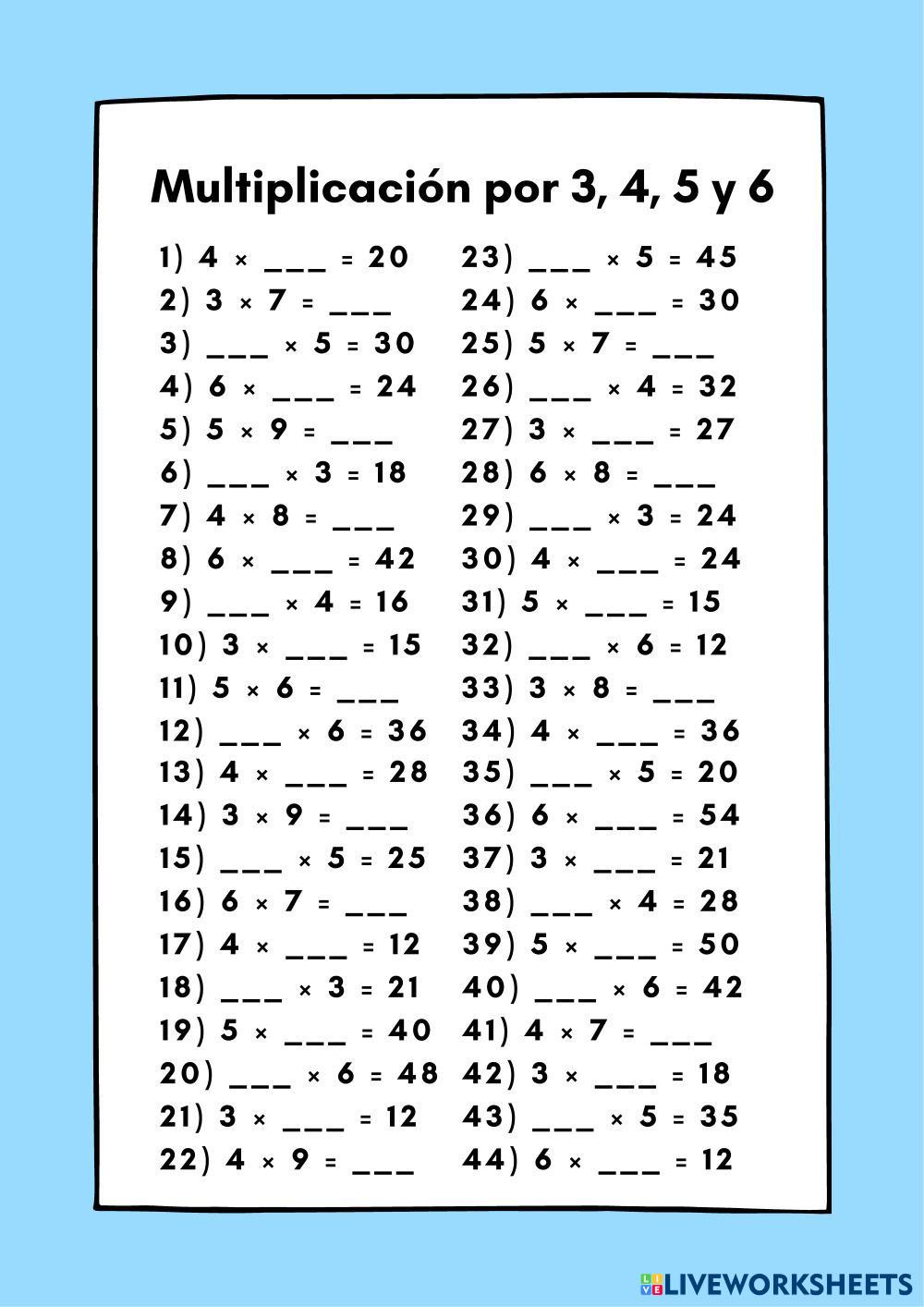 Esta ficha de matemáticas para tercer grado ayuda a tus alumnos a practicar la multiplicación por 3, 4, 5 y 6.