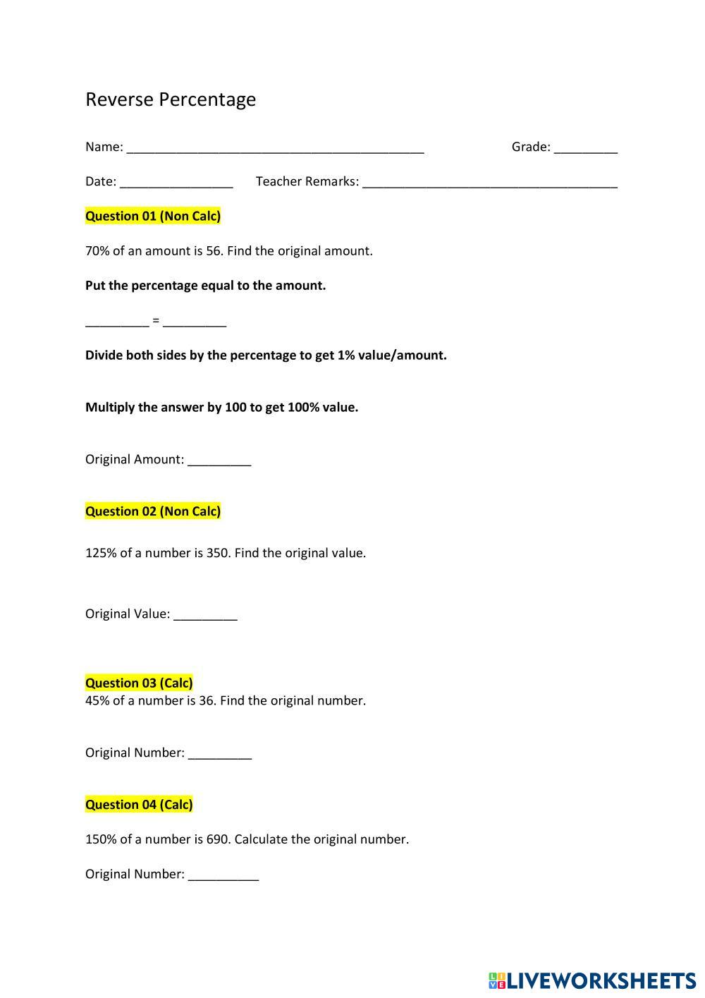 Reverse percentages (or inverse percentages) means working backwards to find an original amount, given a percentage of that amount.